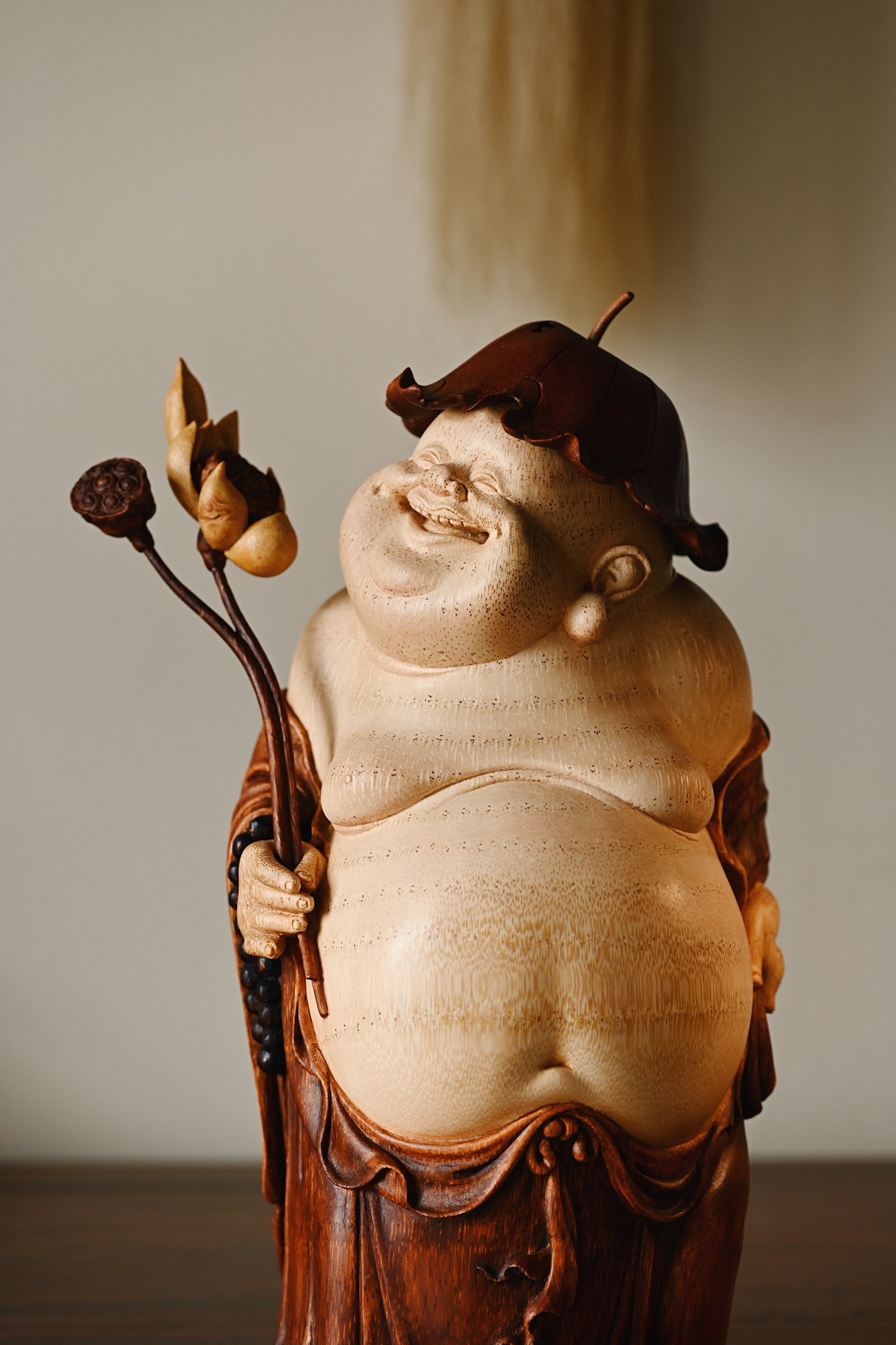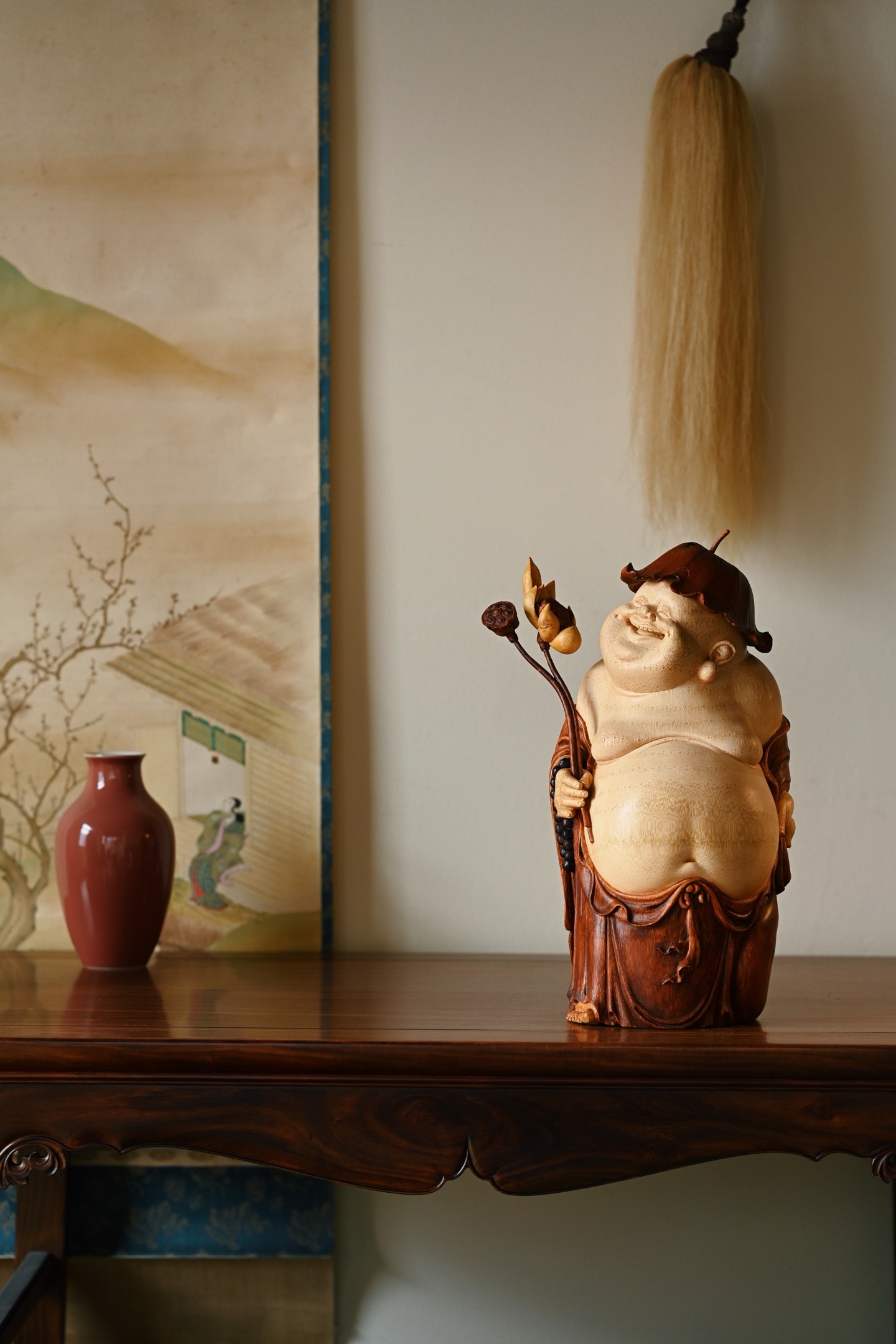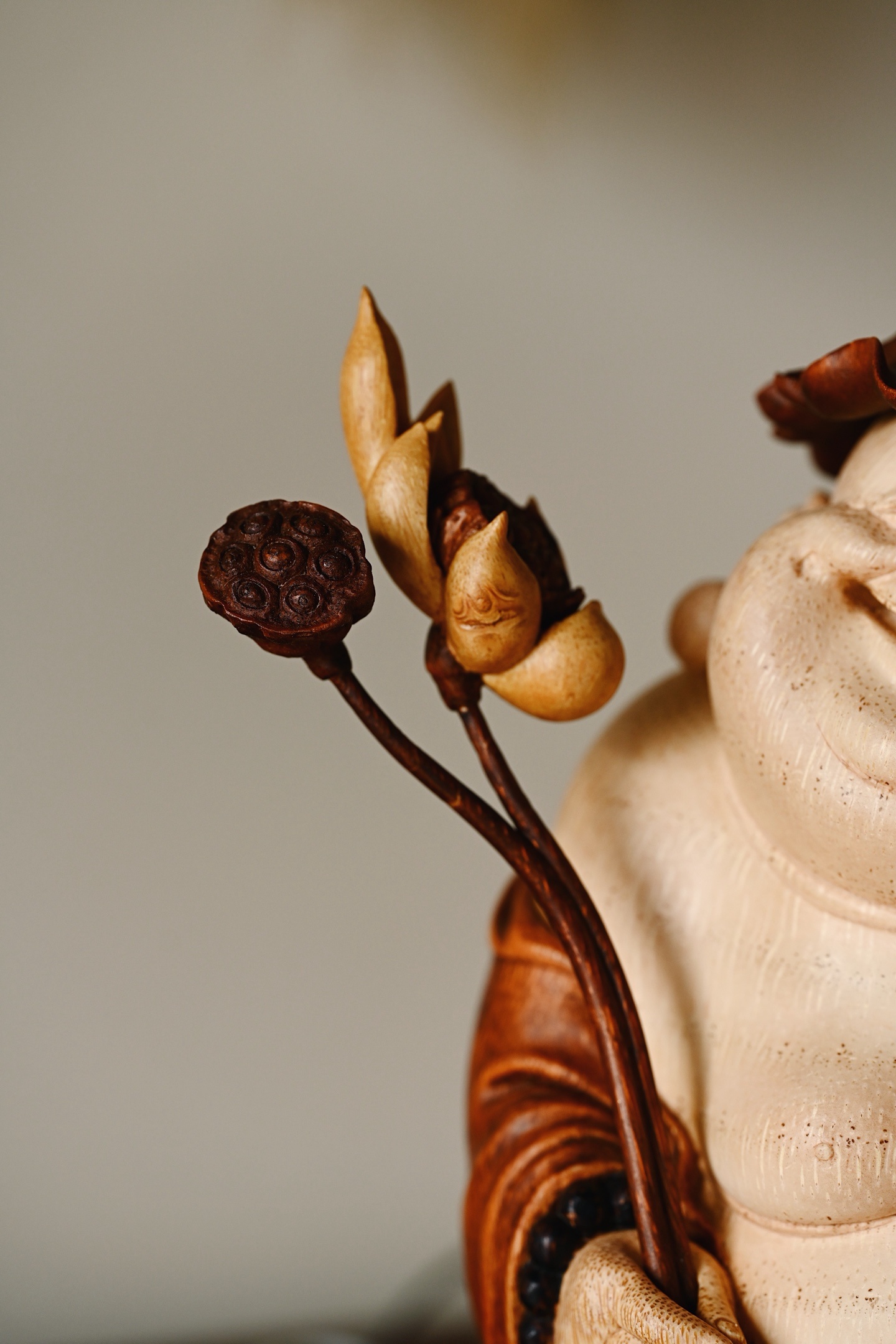 取材质地温润,刻画简洁流畅、自然娴熟,弥勒佛大耳垂肩,坦胸露腹,一手执荷花,一手持佛珠,笑口盈盈,体态饱满,象征”一团和气”。