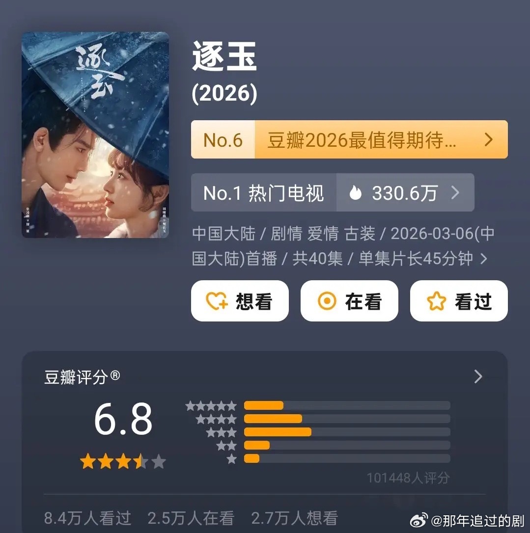 《逐玉》豆瓣口碑6.8分,超10万人评分,以三星四星为主,也就是说,这部剧比上不足比下有余,属于能下饭作品!