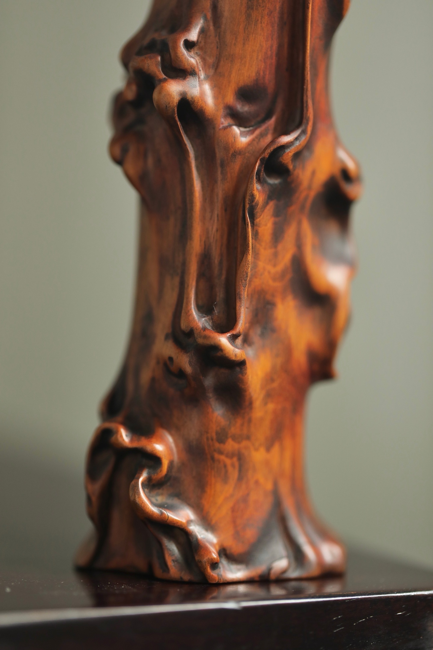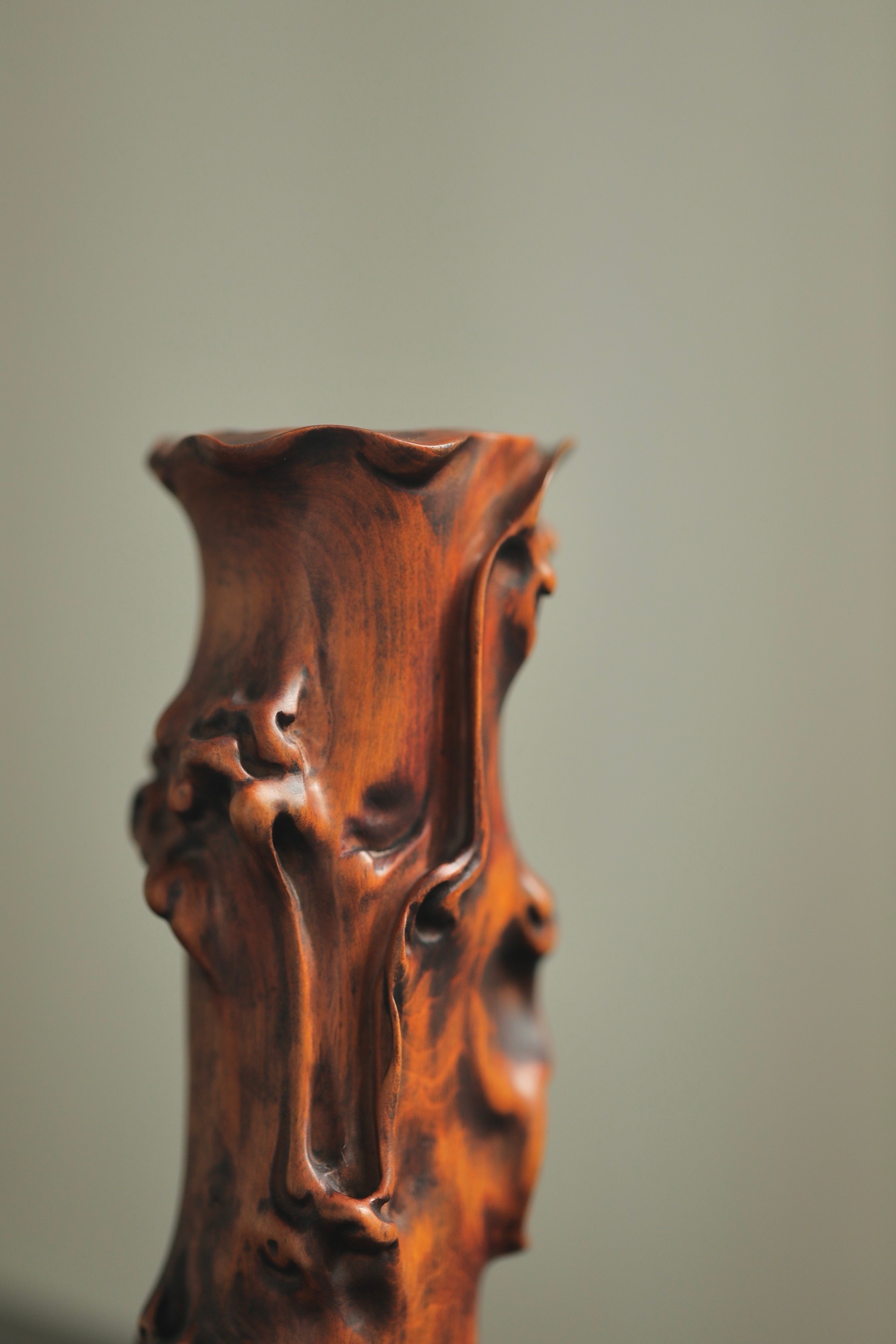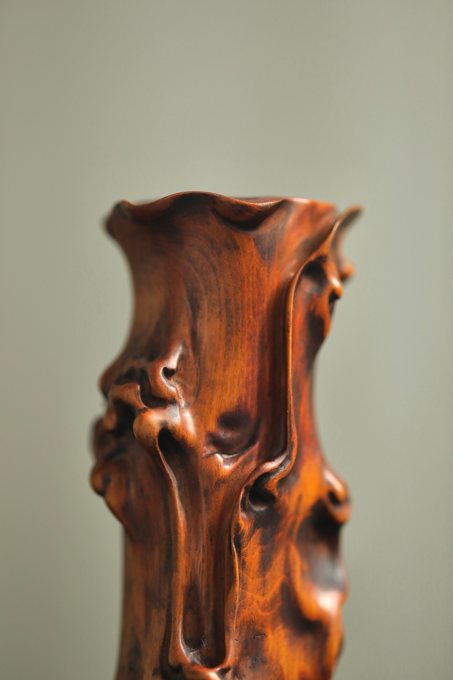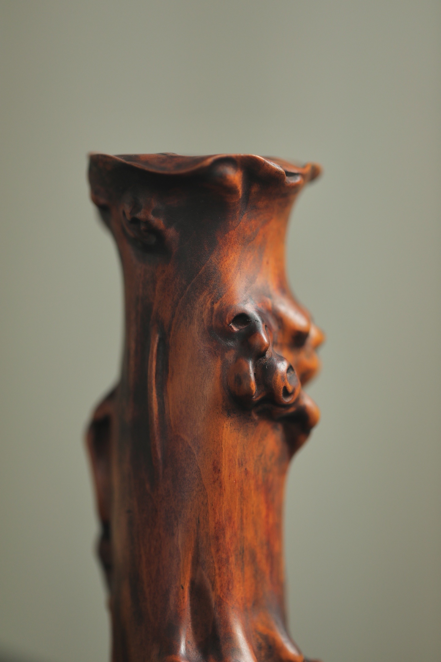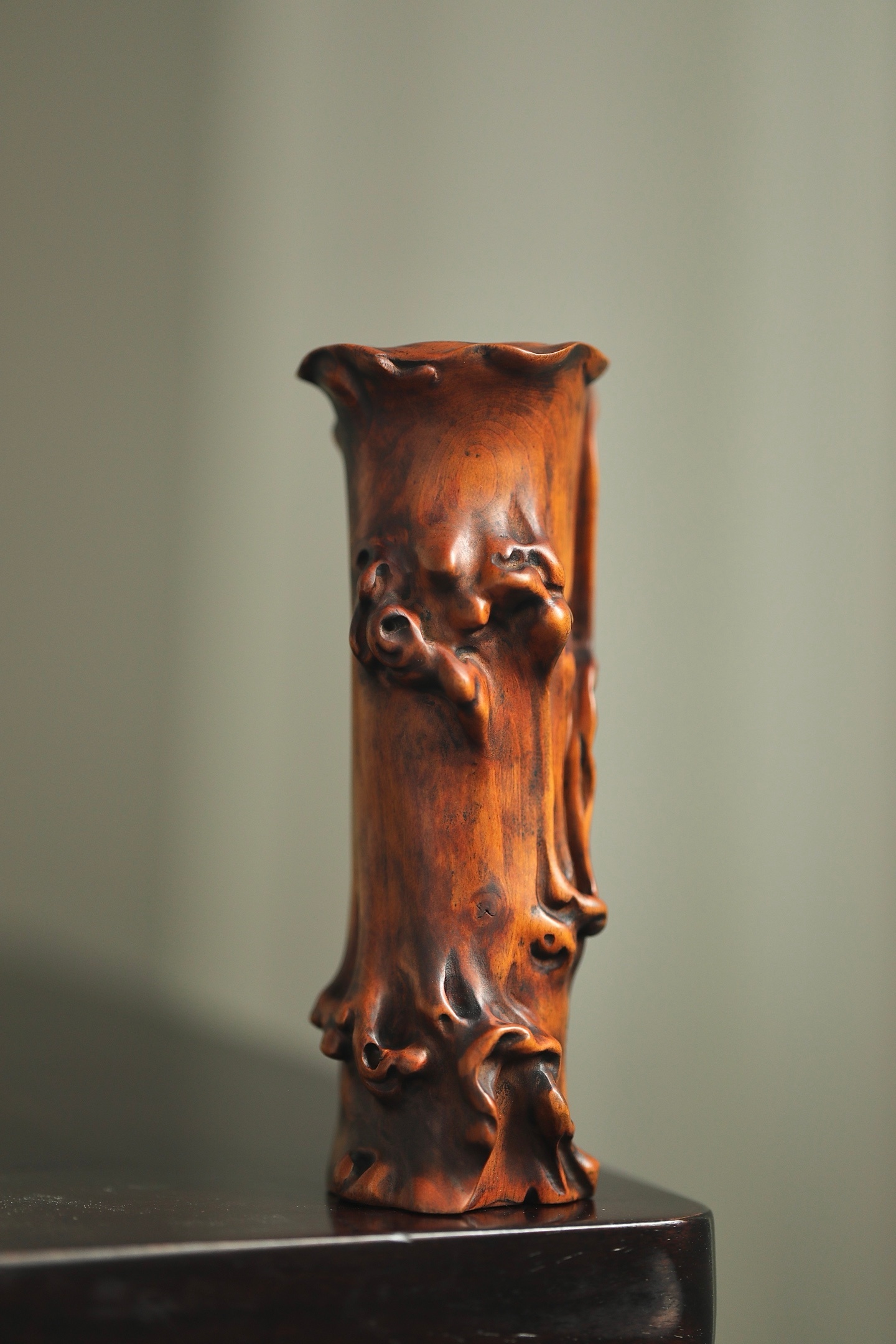 黄杨木 | 仿树瘤花插黄杨木随形雕琢,皮壳温润如蜜,纹理苍劲如古藤。仿树瘤虬曲之