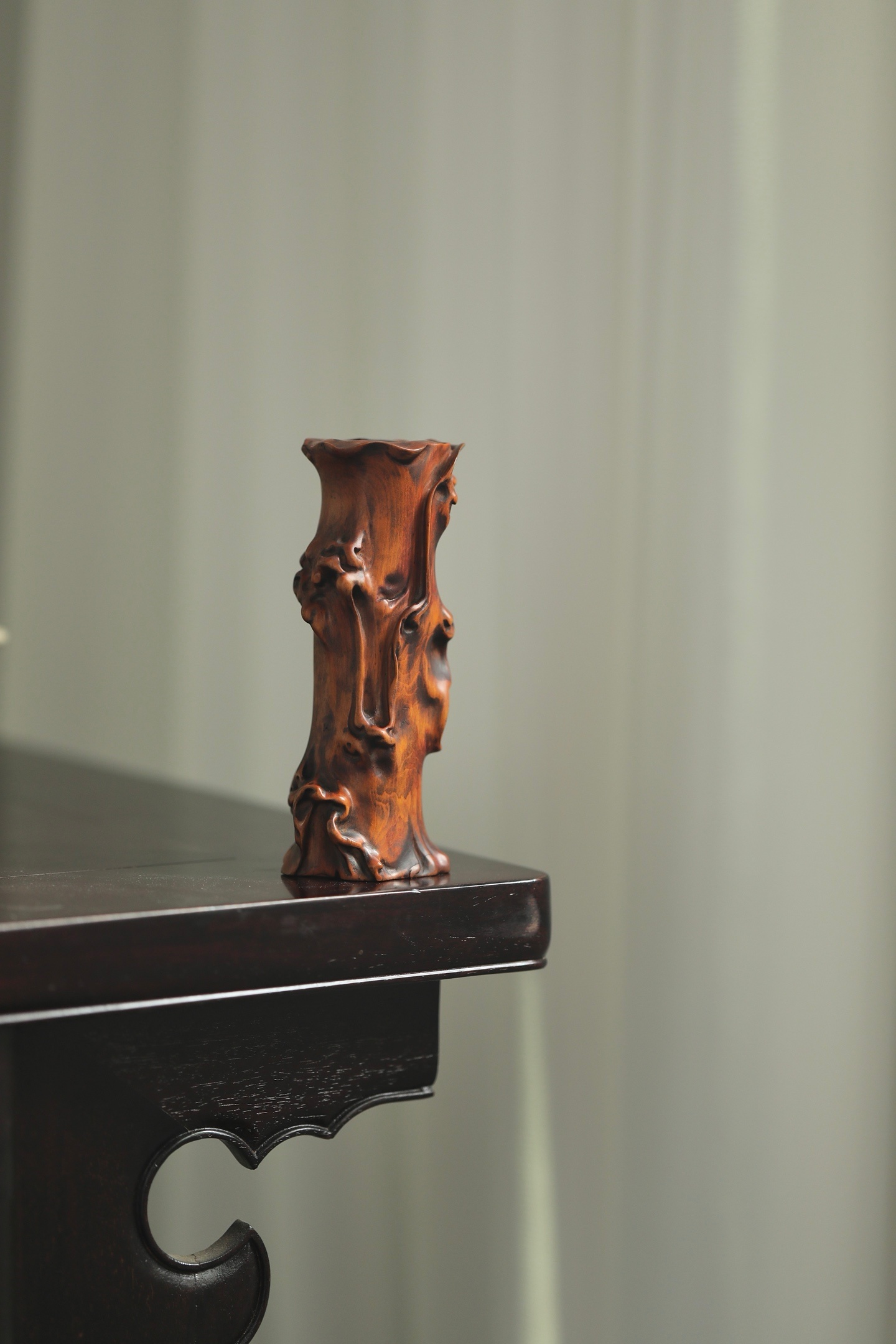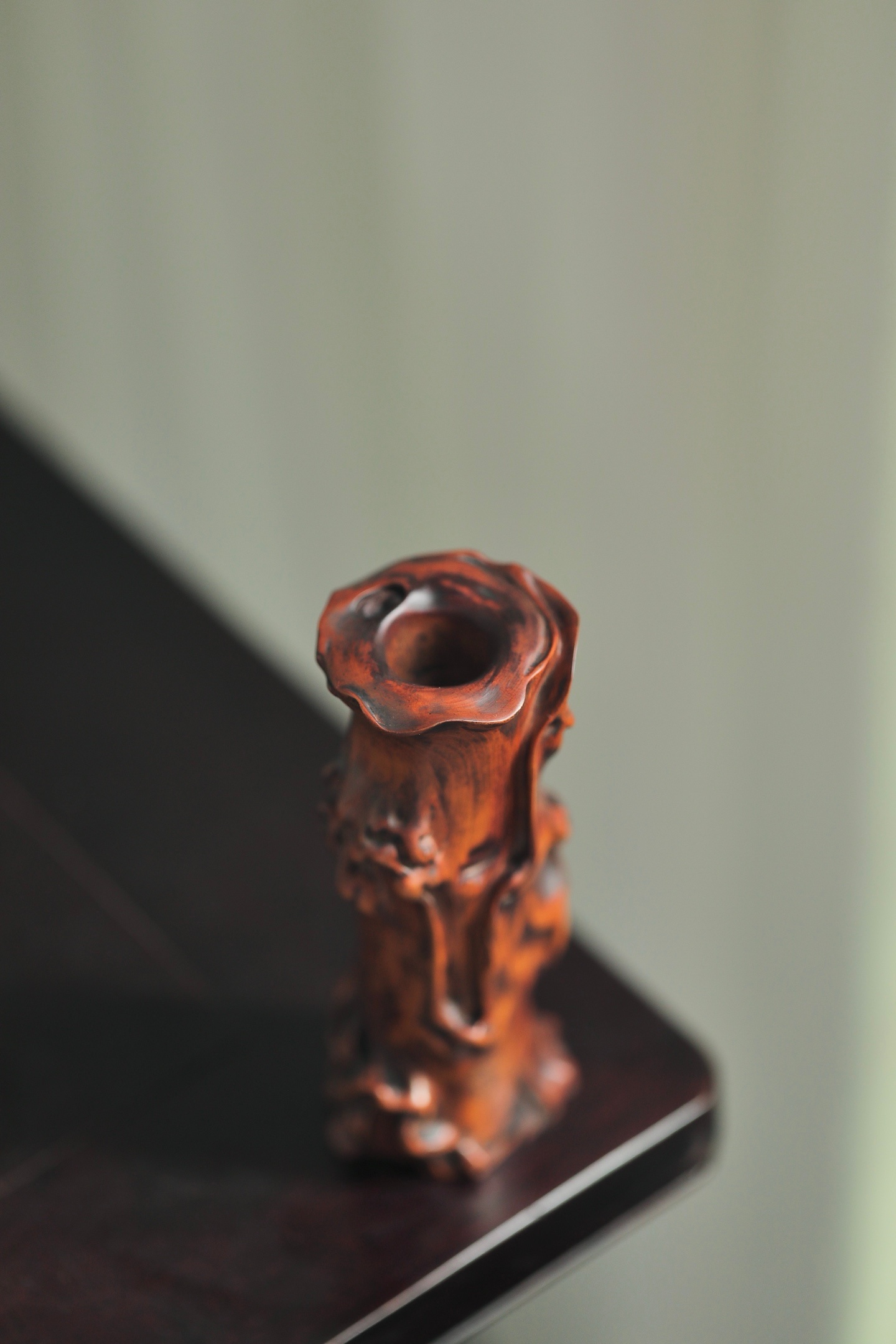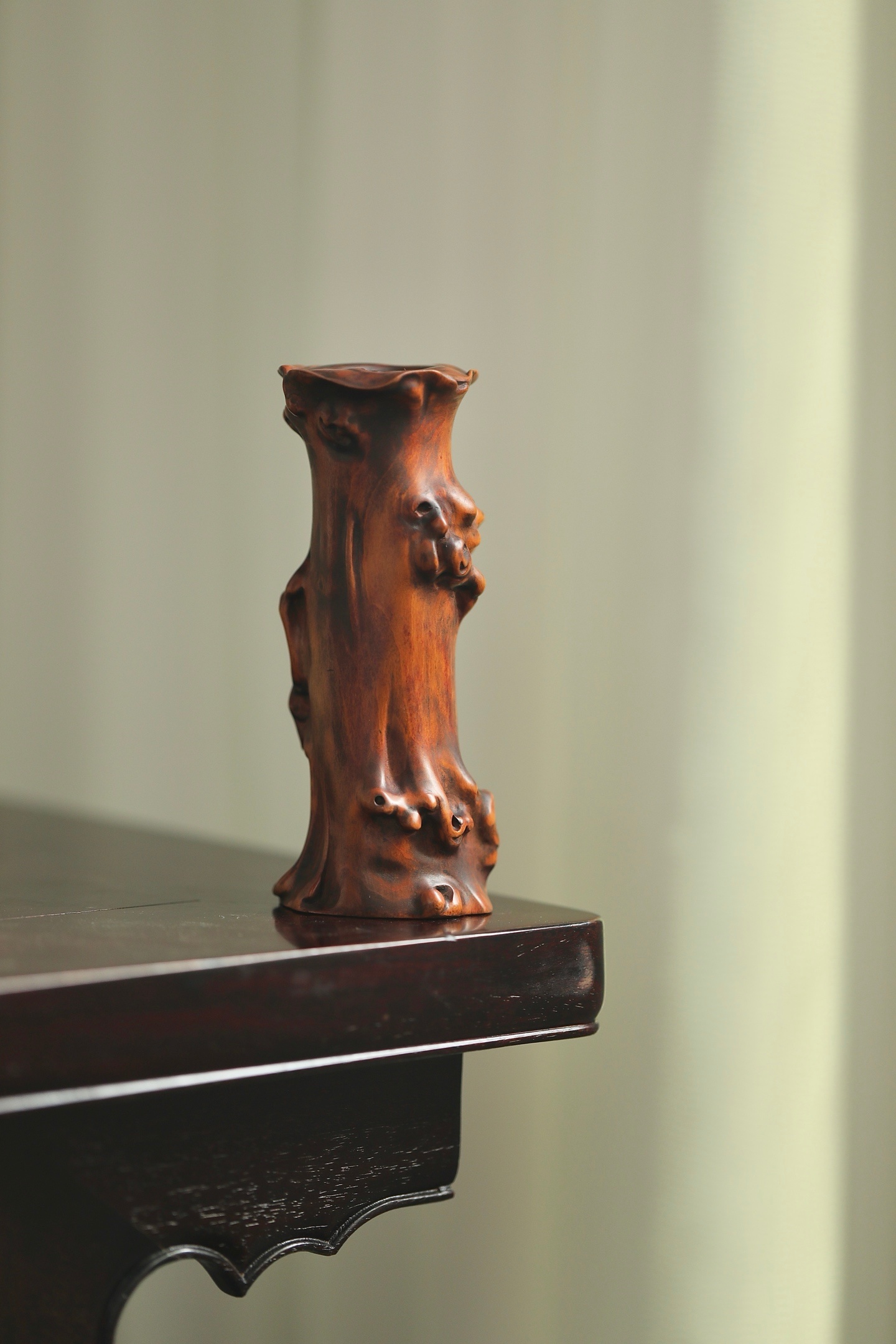 黄杨木随形雕琢,皮壳温润如蜜,纹理苍劲如古藤。仿树瘤虬曲之态,凹凸有致,天然成趣。口沿随木势翻卷,似枯木逢春,藏山野清趣于案头,为文房雅器之逸品。