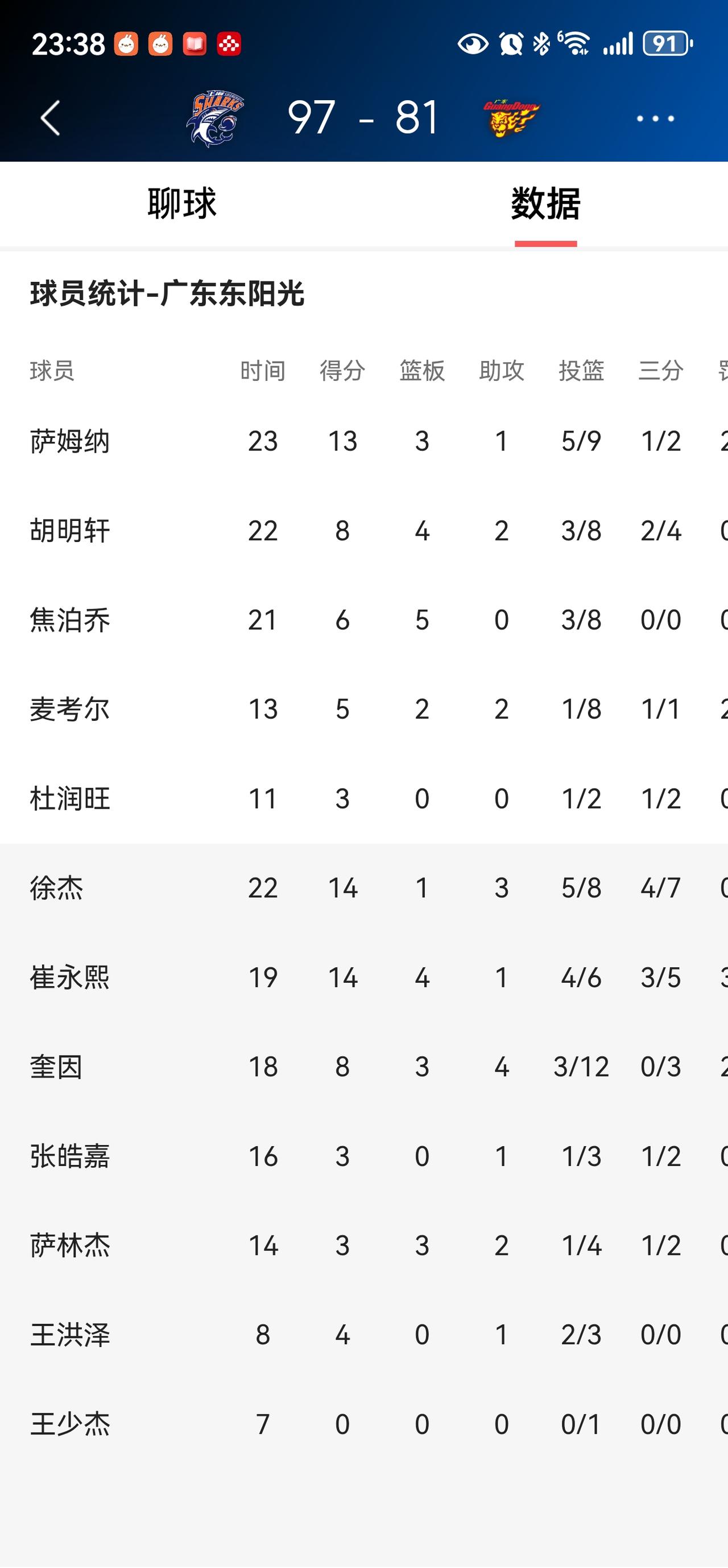 崔永熙:替补上场20分钟,投篮6中4,三分球5中3,罚球3中3,得到14分4篮板1助攻1抢断1盖帽,投篮命中率66.7%,正负值+9。 徐杰:替补上场22分钟,投篮8中5,三分球7中4,得到14分1篮板3助攻,投篮命中率62.5%,正负值+2。 王洪泽:上场8分钟,投篮3中2,得到4分1助攻,投篮命中率66.7%,正负值+3。 麦考尔:上场13分钟,投篮8中1,三分球1中1,罚球2中2,得到5分2篮板2助攻2失误,投篮命中率12.5%,正负值-12。 奎因:上场19分钟,投篮12中3,三分球3中0,罚球2中2,得到8分3篮板4助攻2抢断,投篮命中率25%,正负值-9。 奎因投丢9次,麦考尔投丢7次。输球的罪魁祸首就是奎因和麦考尔。这两货中远投能力太差!