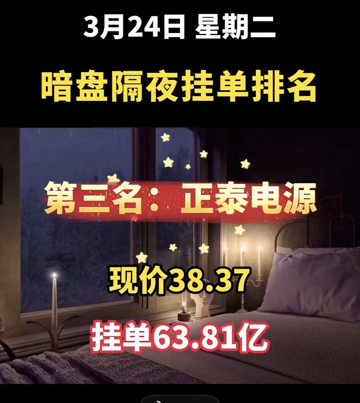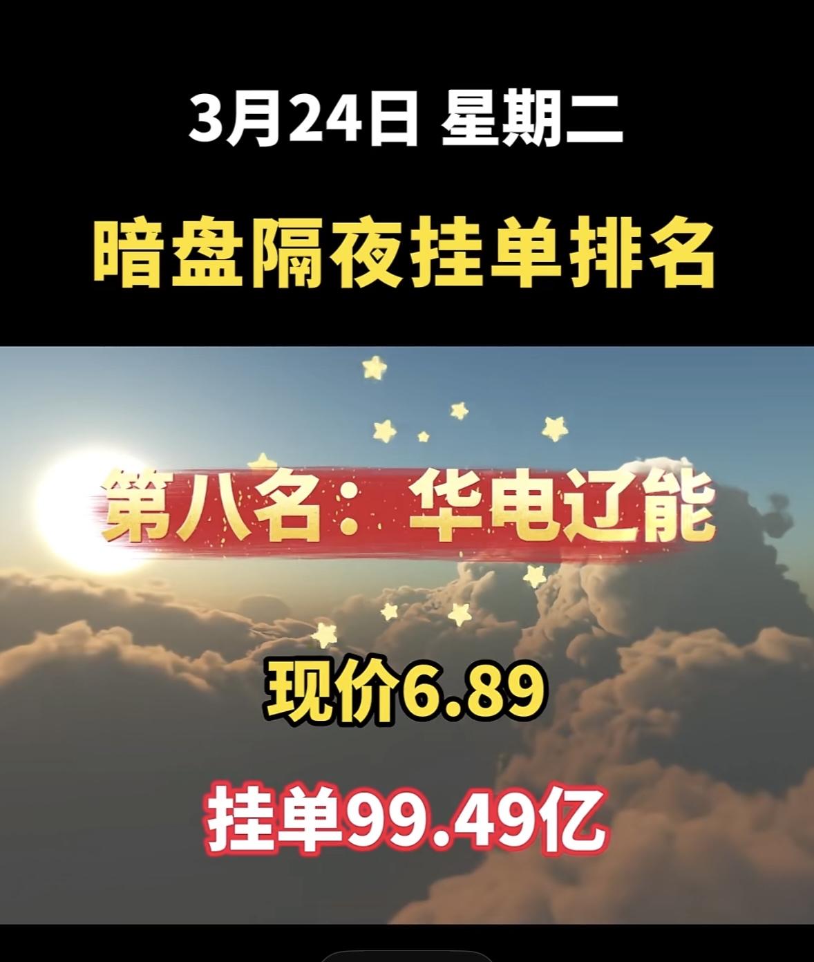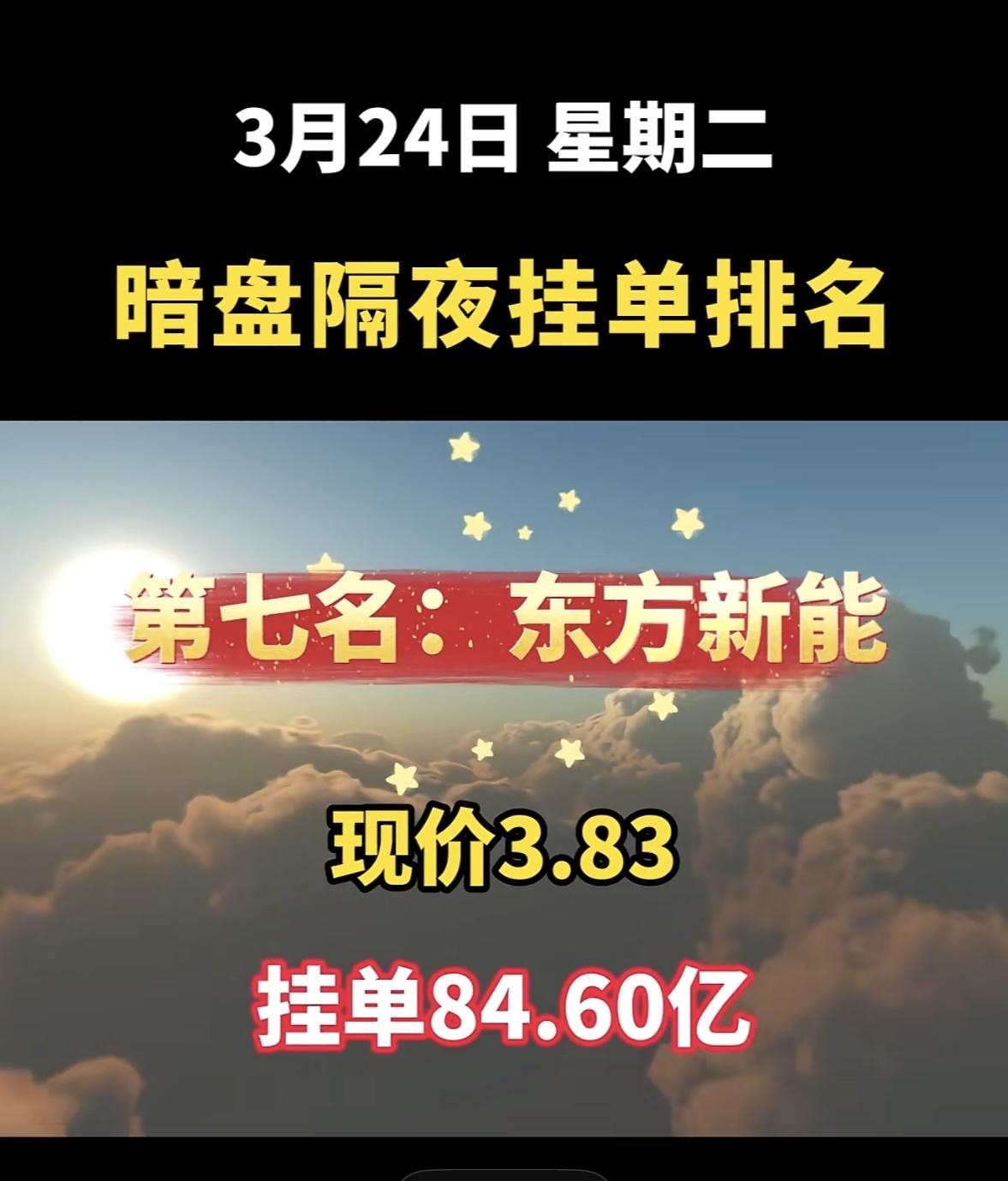 3月24日周二暗盘隔夜挂单排行榜出炉 东方新能源今日暗盘排名第七,现价3.83,挂单84.60亿,这数据看着挺唬人。对比3月23日暗盘隔夜挂单排名,当时东方新能(可能和今日说的是同一只)现价14.66,买单54.26亿,卖单15.29亿。而东方能源(000958)2026年3月2日收盘6.65,当日成交4.37亿,资产总计136.89亿。从这些数据能看出,新能源板块股票波动大,资金流向变化快。东方新能源这次暗盘表现不知后续会怎样,是继续上扬还是回落,值得关注。