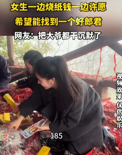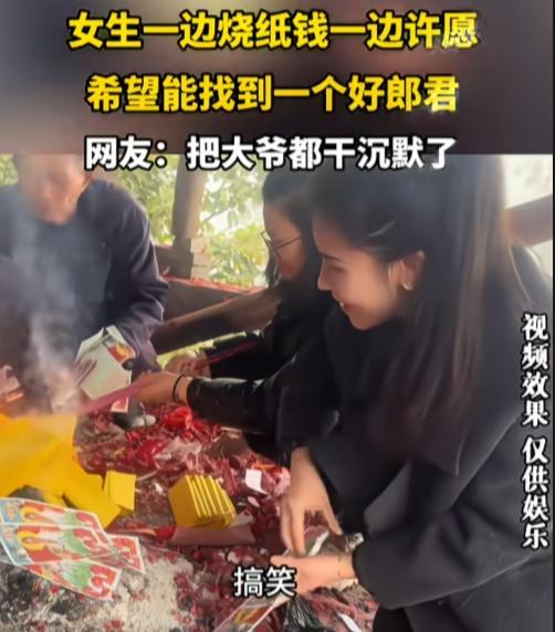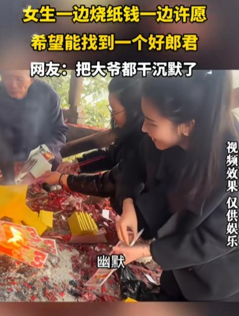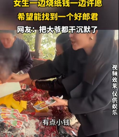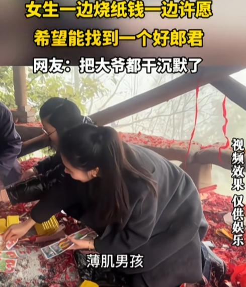 烧5块钱香,许50万的愿,菩萨也难! 一女生一边烧纸钱,一边许愿能找个男朋友,要求一大堆,直接把一旁跟音的大爷给干沉默了。 “求一个男朋友。”女子话音刚落,大爷直接跟音复述愿望,“额找个好男朋友嘛。” “求个……185,薄肌男孩、幽默、搞笑,有点小钱。”女子烧一张纸钱,提一个要求,大爷沉默不许,不再跟音。 这么多要求,真是花小钱办大事的感觉,把纸钱的价值发挥最大作用。女子真聪明啊! 就是全国符合这条件能有几个?就算有会看上她吗?估计一会火就灭了。 菩萨直言:办不了,下一个!