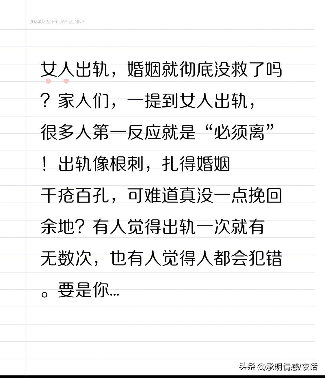 女人出轨,婚姻就彻底没救了吗? 家人们,一提到女人出轨,很多人第一反应就是“必须离”!出轨像根刺,扎得婚姻千疮百孔,可难道真没一点挽回余地?有人觉得出轨一次就有无数次,也有人觉得人都会犯错。要是你遇到这事,会咋选?是果断离婚,还是给次机会?快来评论区说说!剖析出轨原因 婚姻出轨困境 婚姻出轨征兆