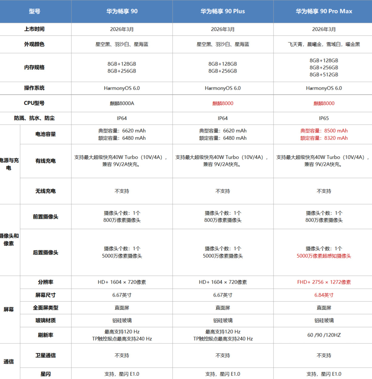 睡之前再补一个畅享90系列三款手机的参数/区别,正如大嘴所说,华为手机全系全面回归。麒麟+5G+鸿蒙6,已经下探到1299元,也许看起来没什么性价比,但畅享90 Pro Max放在相同定位的很多线下机里,其实也还行?当然,你也可以买不同定位的性价比机子。