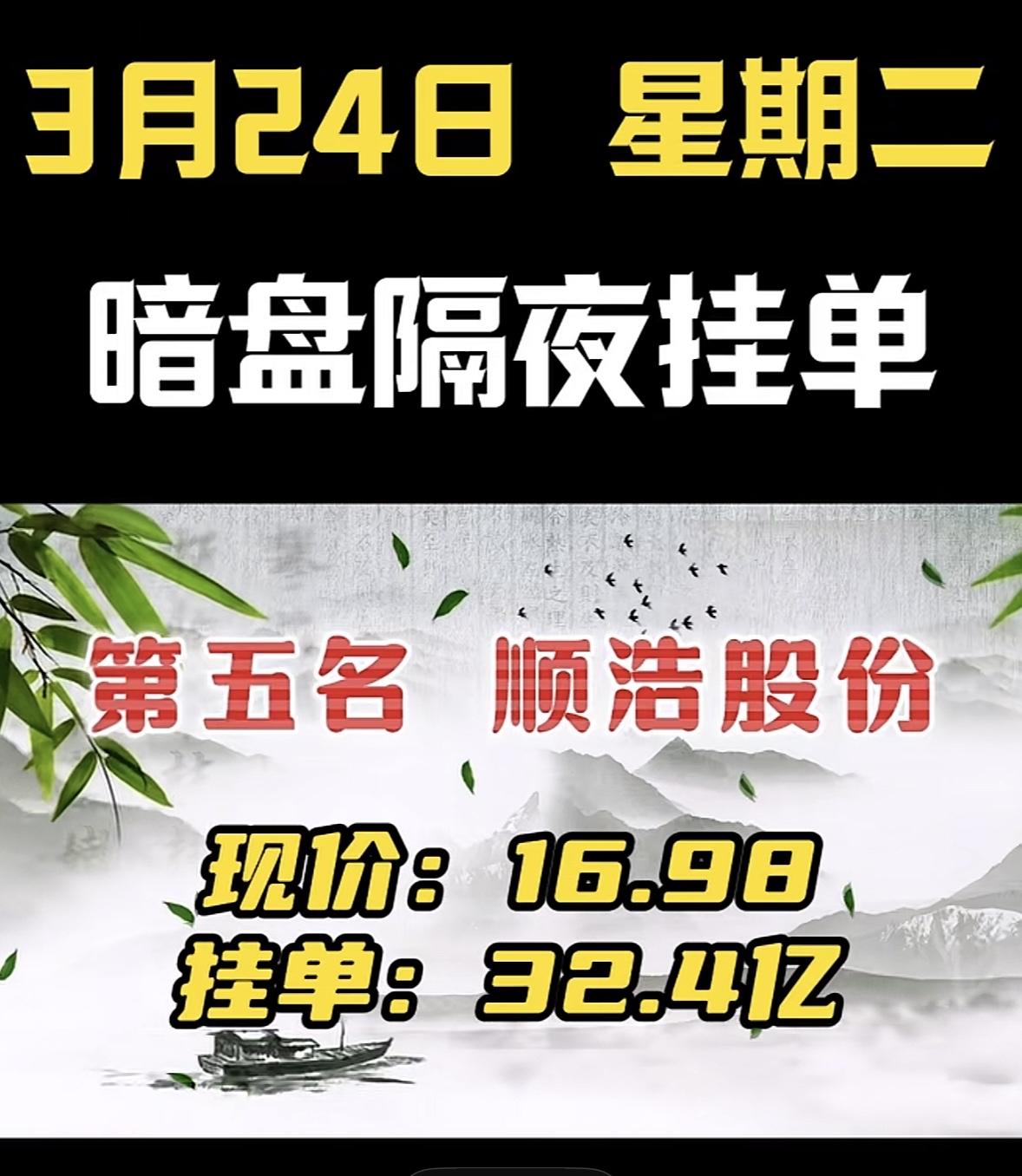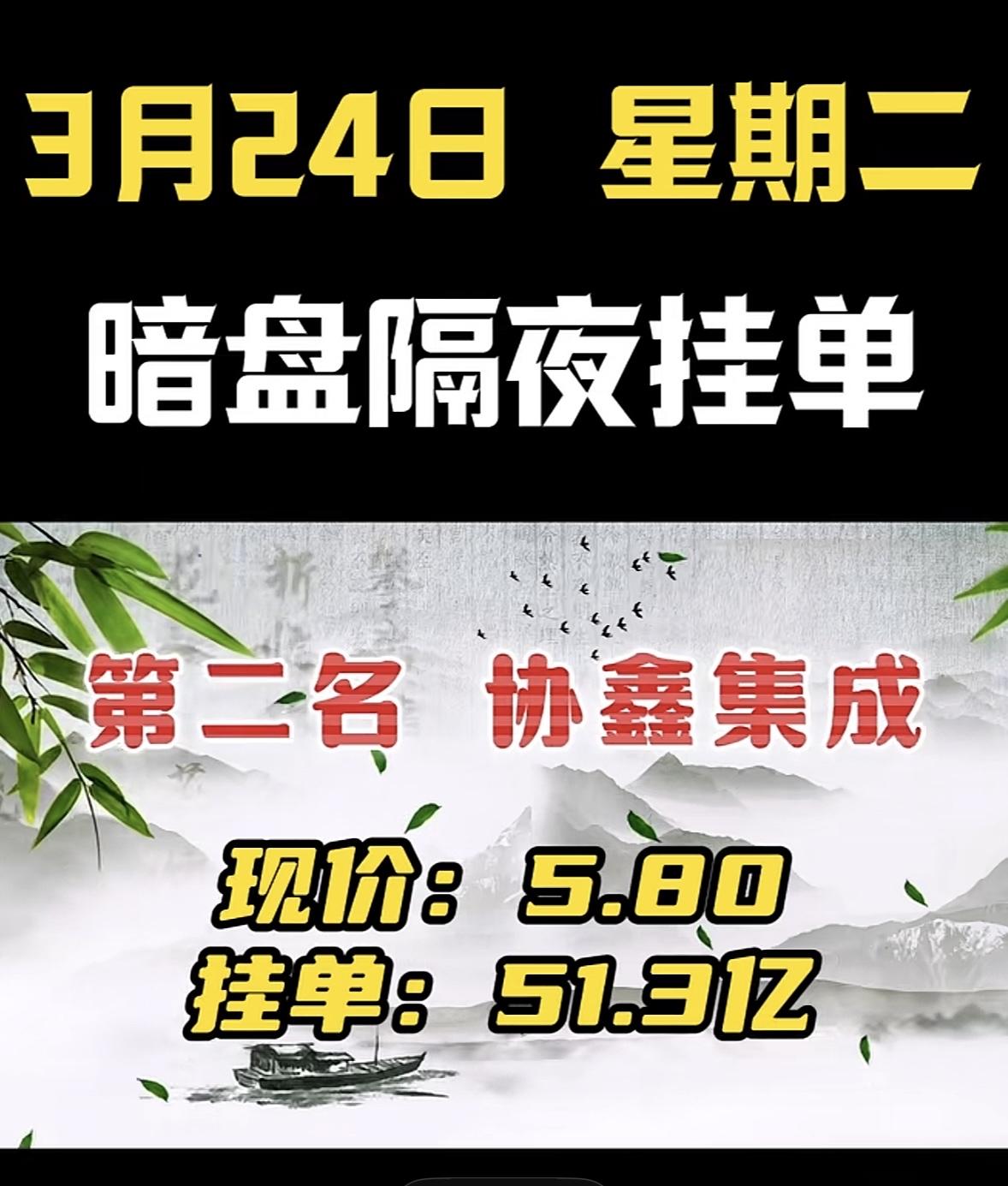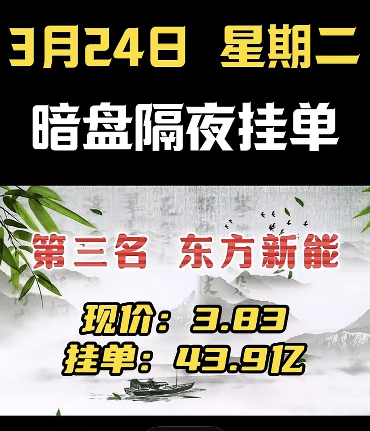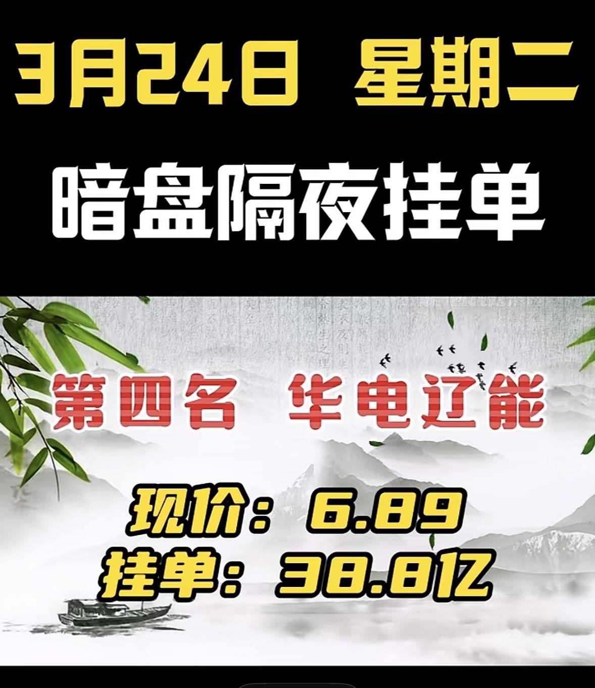 3月24日周二暗盘隔夜挂单个股揭晓 3月24日,华电辽能现价6.89,竟有38.81亿的挂单,这数据太惊人了!回顾之前的暗盘隔夜挂单情况,华电辽能一直备受关注。3月19日它就排第六,当时现价5.17,买单66.49亿,卖单14.06亿。到了3月23日,它更是冲到第一,现价6.26,买单97.66亿,卖单32.39亿。这次3月24日的挂单金额也相当可观,看来华电辽能在暗盘市场热度持续高涨,后续走势值得好好关注,说不定会有大行情呢。