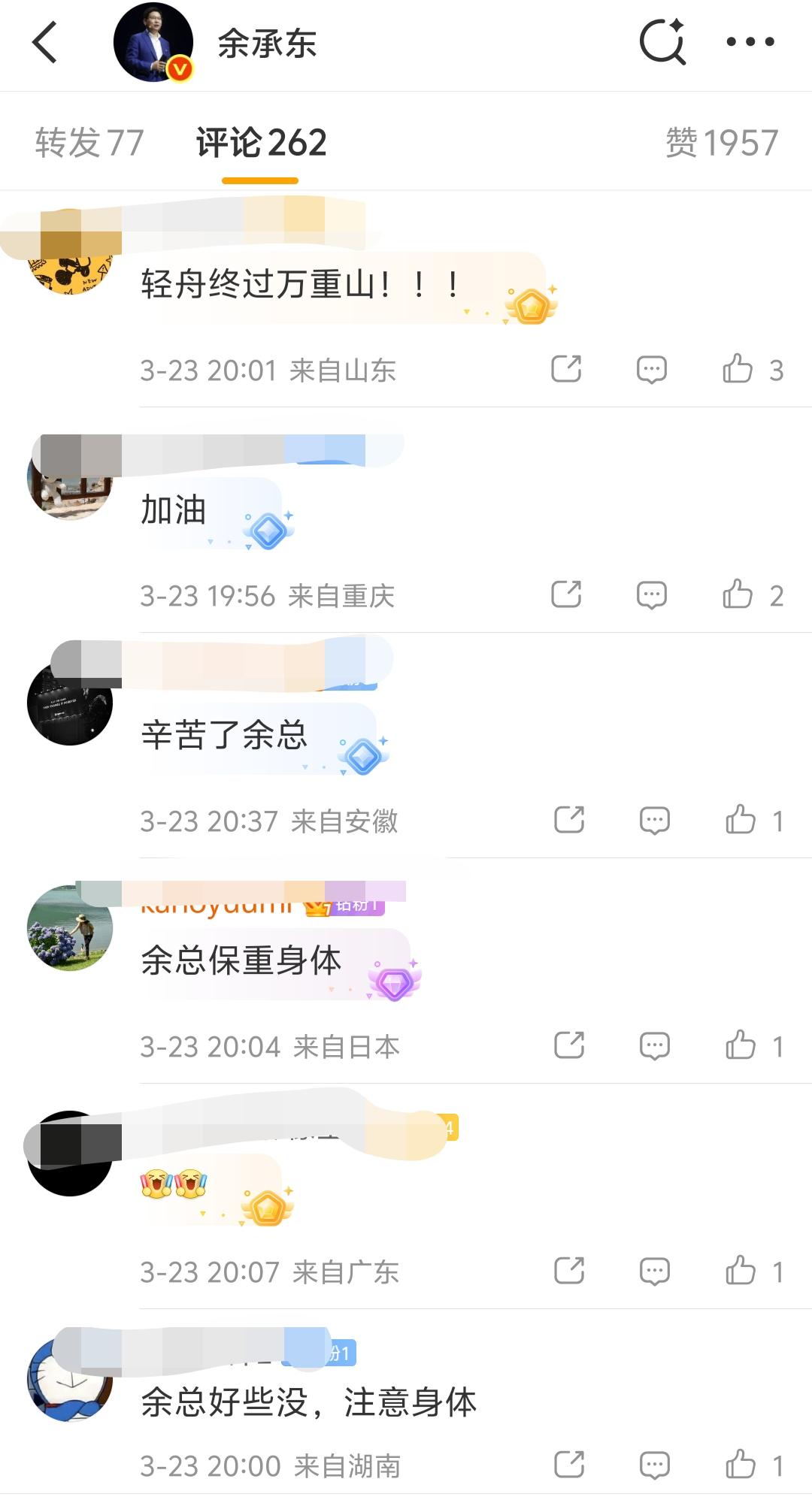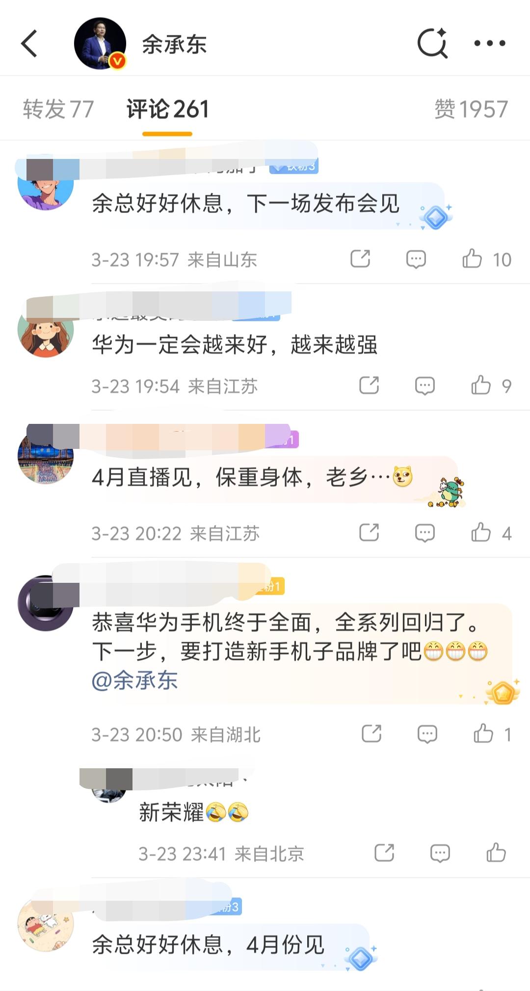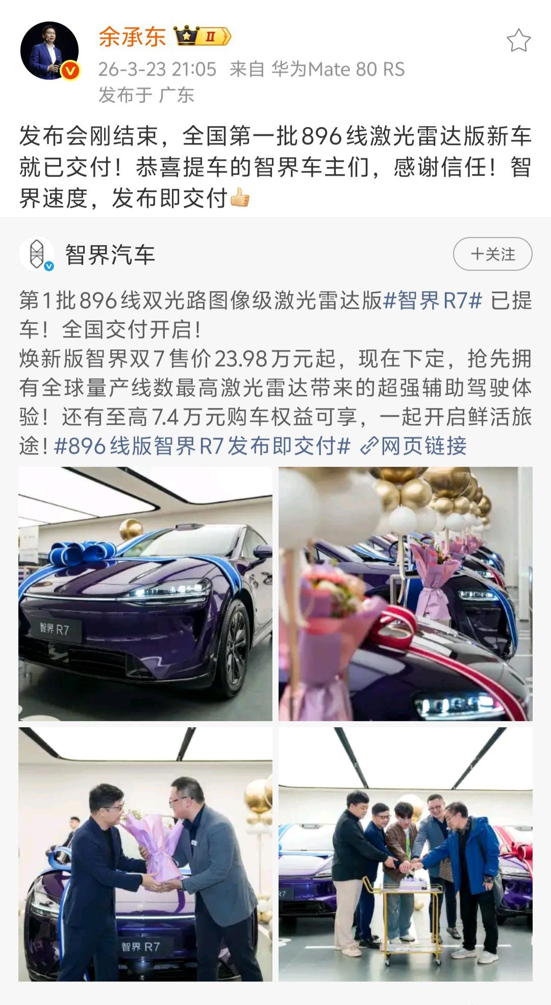 余总这是间接报平安了吗?因为身体原因缺席华为春季新品发布会的余承东,时刻心系发布会后续进展。这不,他在发布会结束后当天晚上连发两条微博,既是报喜,也算是间接向关心他的粉丝们报平安了。 余承东在3月23日晚上19:53发了第一条微博动态,宣布搭载麒麟芯片与全新鸿蒙操作系统的华为畅享90系列正式发布,标志着华为手机实现全面回归。他在微博中向一路支持的用户致谢,并邀请大家体验全新机型,同时转发@华为终端的内容,配图展示了畅享90 Pro Max与畅享90 Plus两款新品。 接着,余承东又在21:05再度发博,宣布全国第一批896线双光路图像级激光雷达版智界R7新车已完成交付。他转发了智界汽车的官方微博,向首批提车的智界车主送上祝贺,感谢用户信任,并以“智界速度,发布即交付”形容本次高效交付。 在智界官方微博的动态中,全国第一批896线双光路图像级激光雷达版智界R7提车现场十分热闹欢乐。 在余承东微博评论区,很多粉丝和网友纷纷留言叮嘱余总保重身体,注意休息,并期待他主讲4月份的发布会与直播。 此次发布会实现了华为终端手机与汽车业务的双线突破,既宣告华为手机全面回归,又以“发布即交付”的模式刷新新能源汽车行业效率,彰显华为在终端与智能汽车领域的核心竞争力。 只是,余总真的需要注意身体了,在华为分管那么多工作,啃的都是别人啃不动的硬骨头,常常分身乏术,工作强度可不是一般企业高管所能比的,没有强健的身体,真的扛不住这样的连轴转。华为 余承东