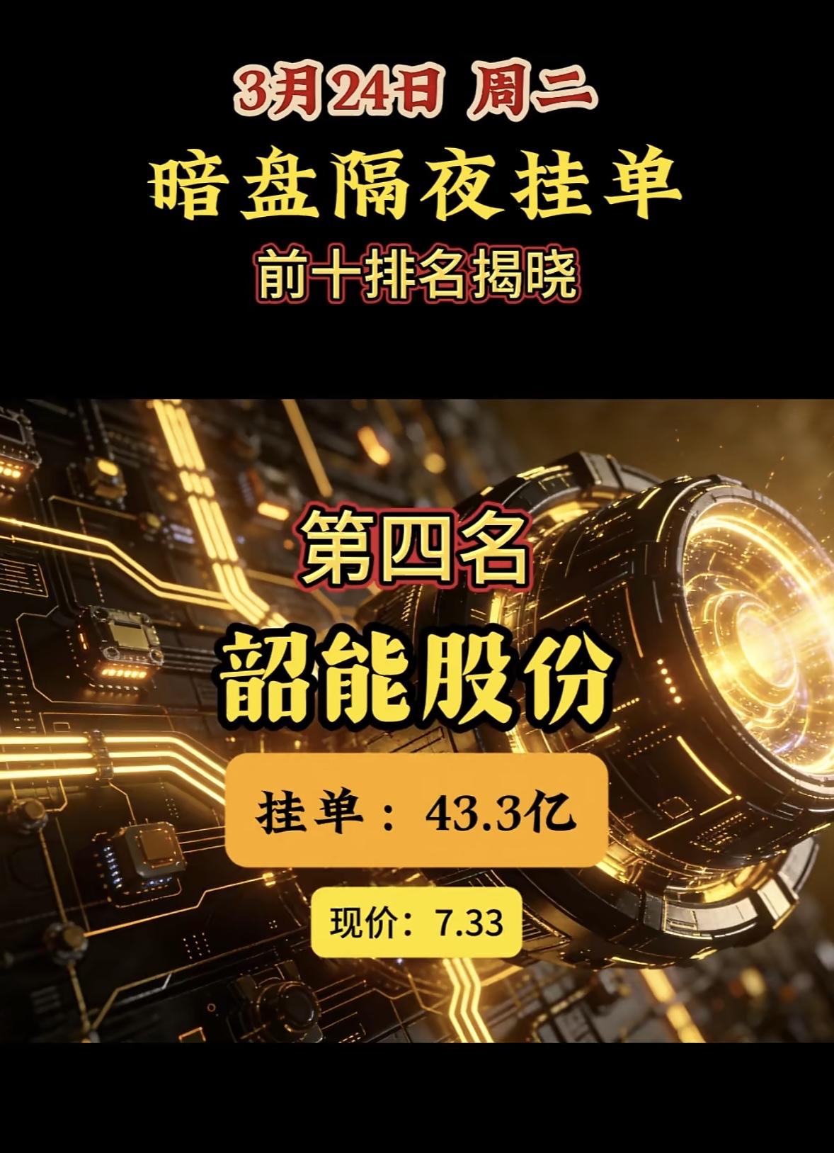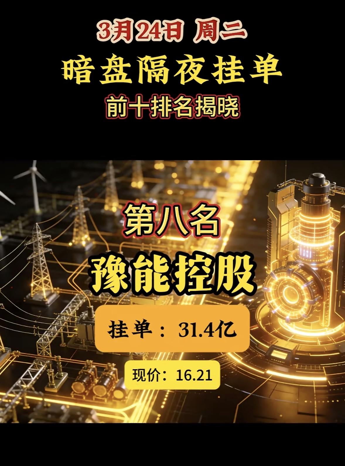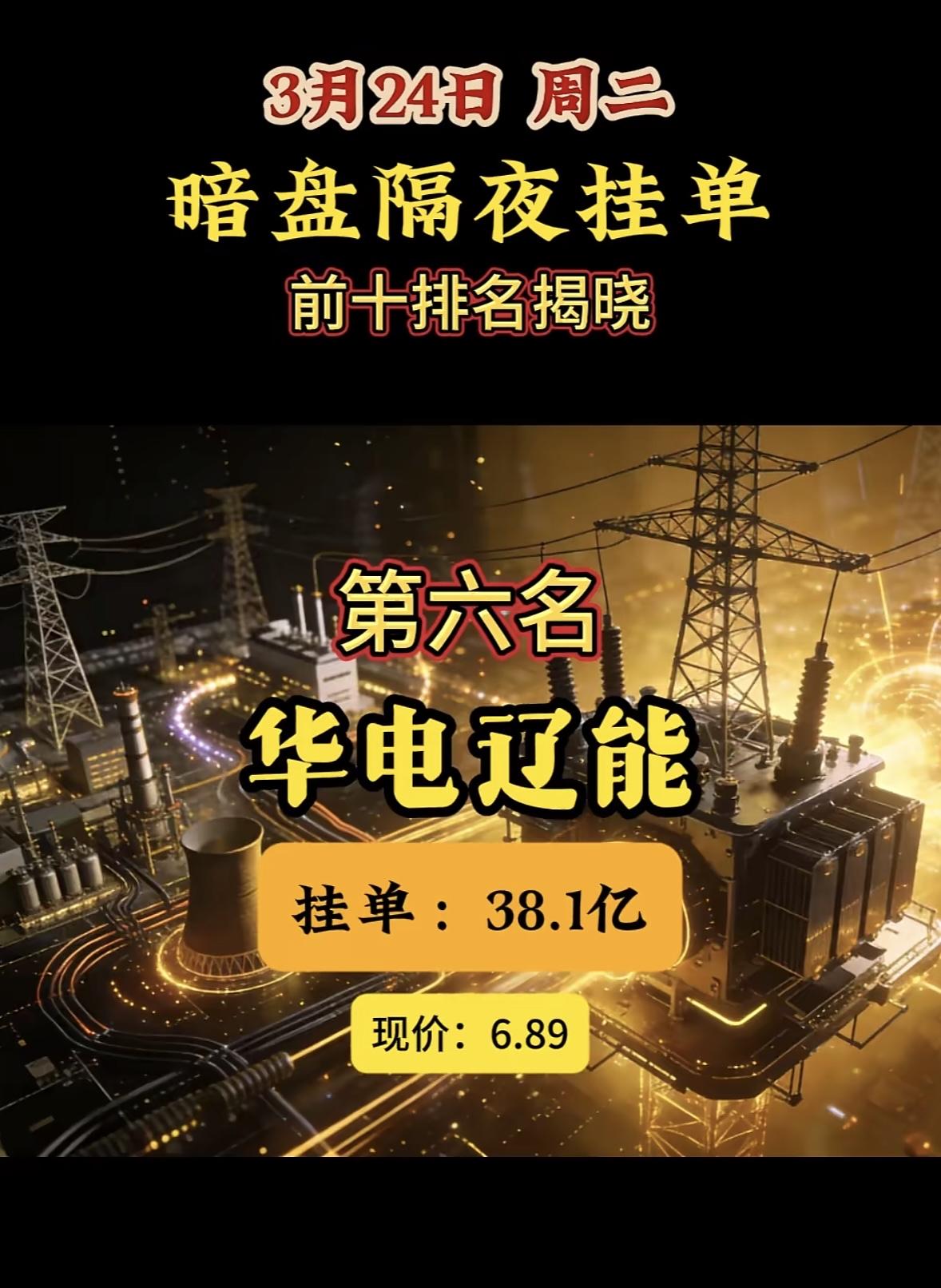 3月24日暗盘隔夜挂单排行榜出炉 昨天3月23日暗盘隔夜挂单的情况很值得说道。有一份排名显示,第一名是中利集团,现价3.81,买单高达134.49亿,卖单22.37亿;第二名兆新股份,现价4.49,买单125.54亿,卖单35.22亿。 不过还有另一份排名,这里面第一名变成了华电辽能,现价6.26,买单97.66亿,卖单32.39亿;第二名是华电能源,现价5.52,买单84.54亿,卖单16.30亿。 这两份排名差异还挺大,不知道最终揭晓的前十名会是怎样的组合,投资市场真是充满变数啊!