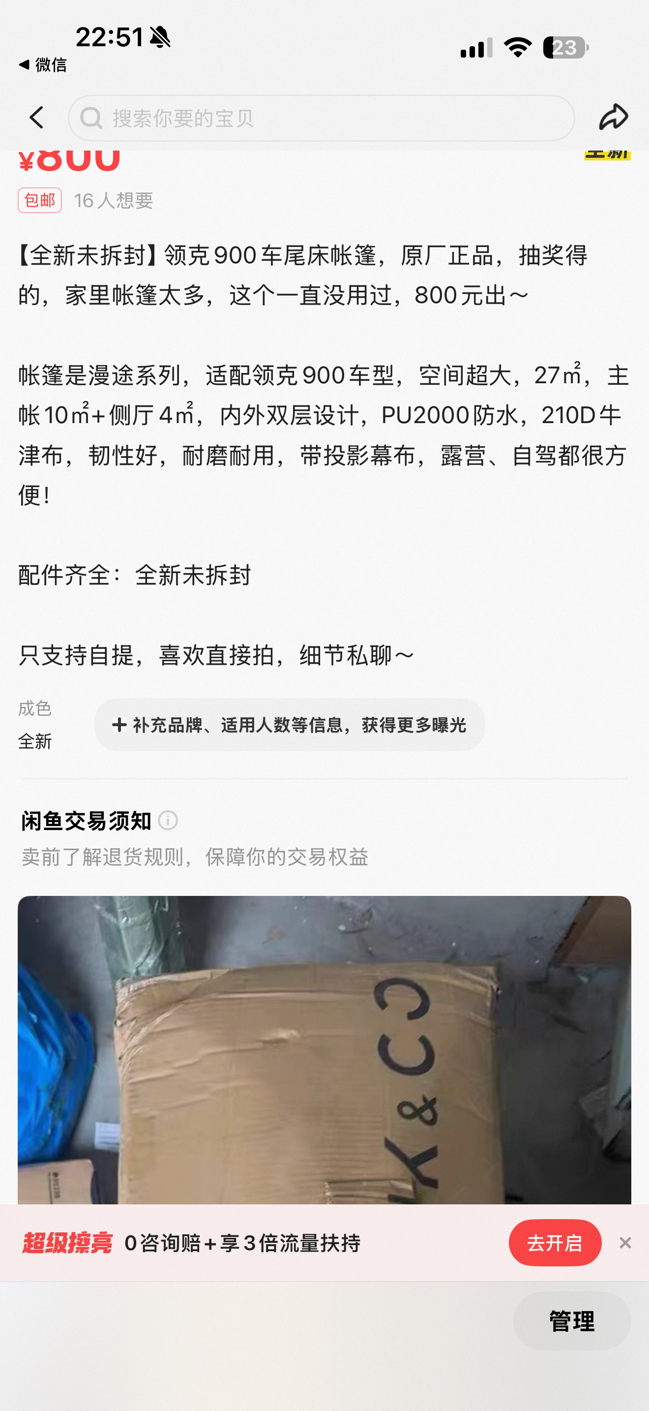 我之前抽奖中的领克900车尾帐,之前咸鱼卖给这人,他说老婆不允许,没买最后,退了。今天老婆不在,他要趁着这个月黑风高的夜晚砍价私房钱把这个买了