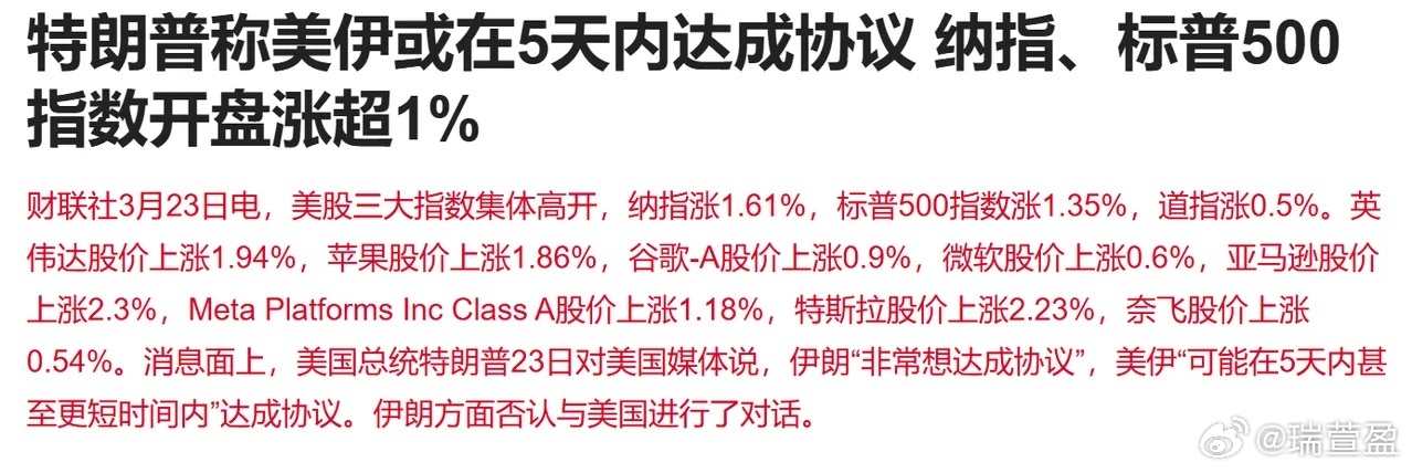 尾盘利好终于落地,特朗普再度发声释放积极信号,宣称有望在五天甚至更短时间内达成相关协议,伊朗方面迫切希望签约,双方已就协议核心要点达成一致。