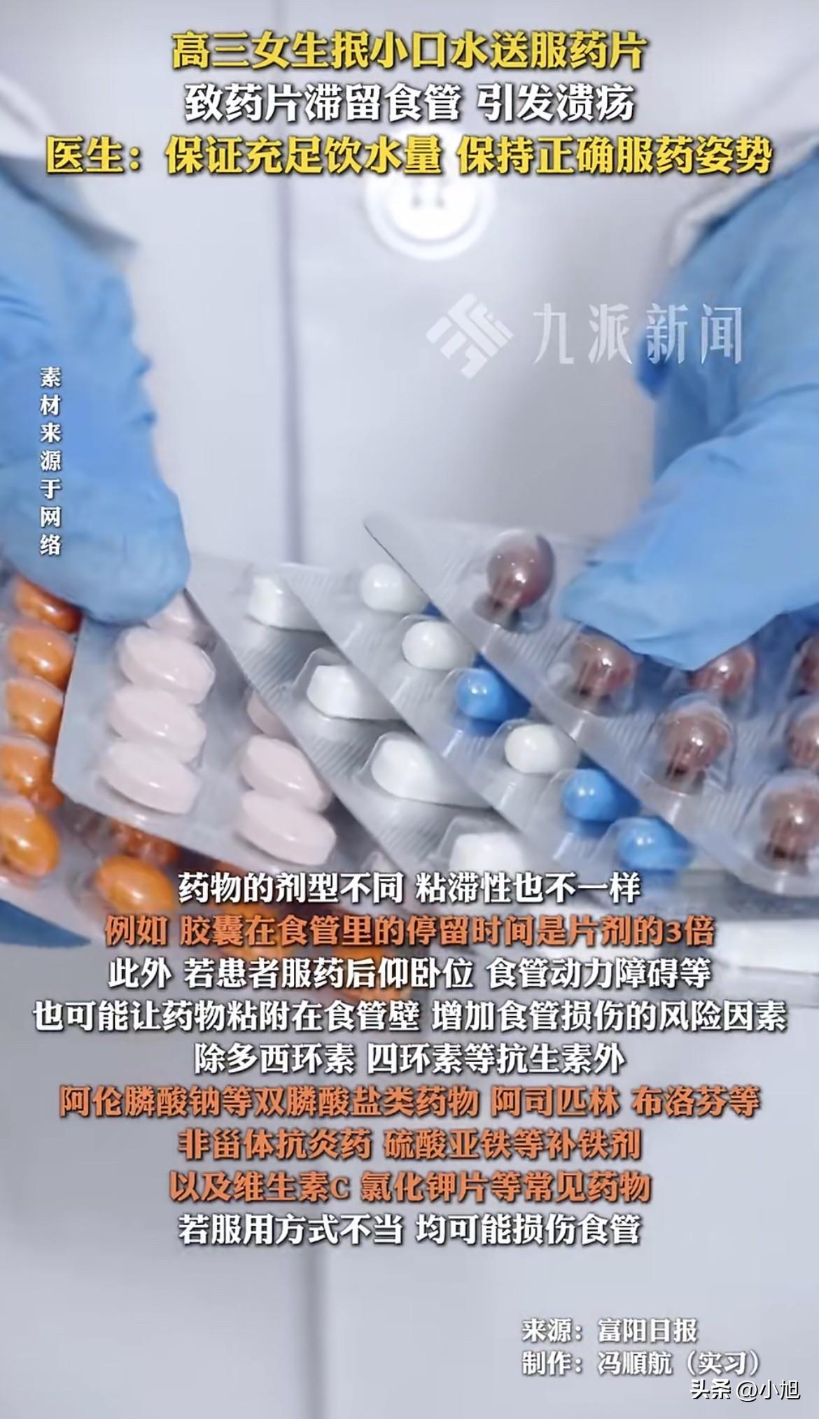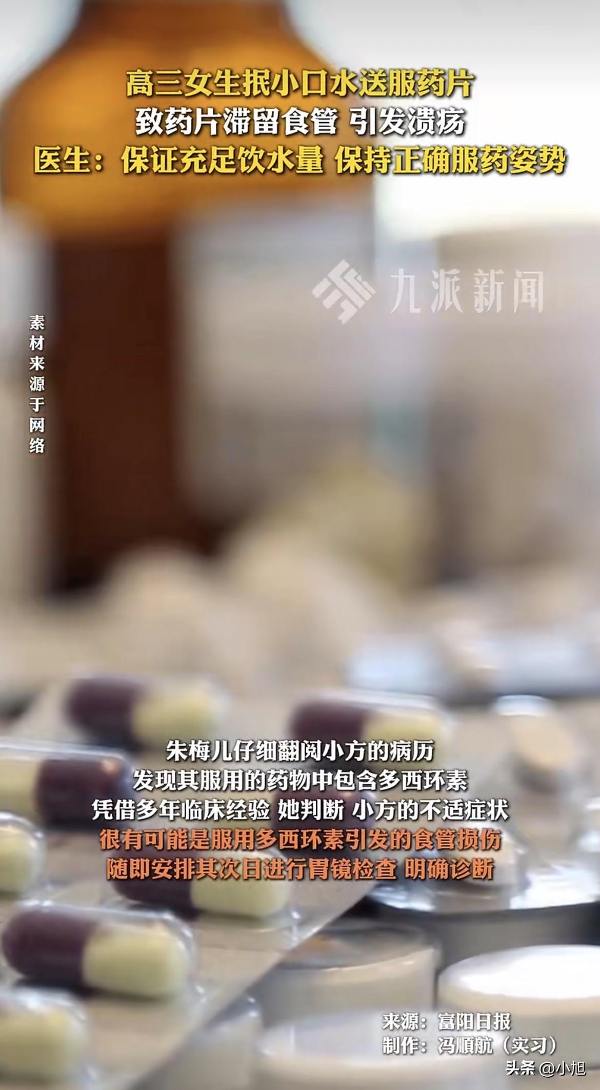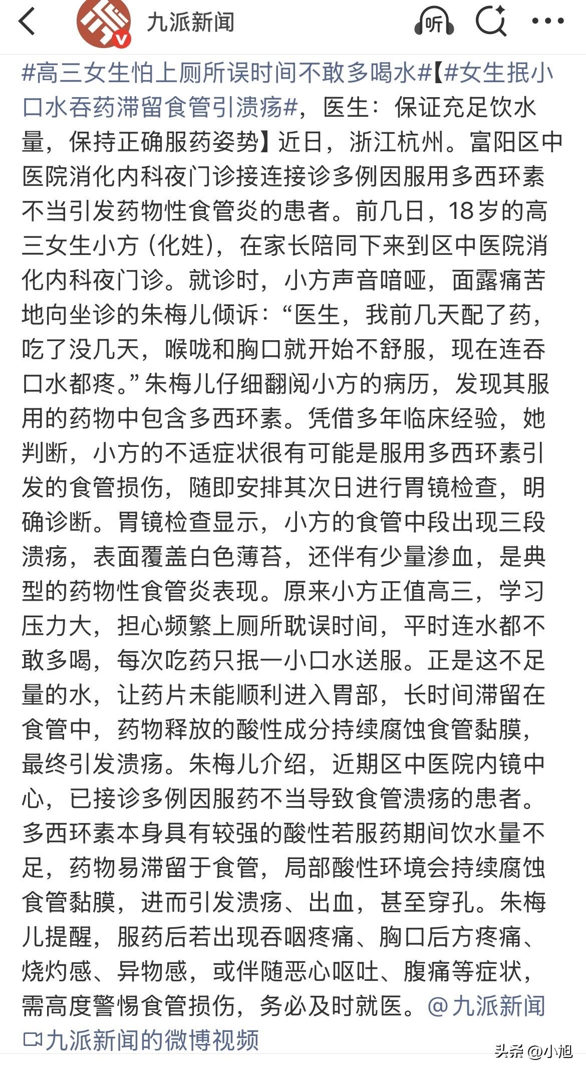 一个高三女生,吞了颗药,食管烧出三段溃疡。 浙江富阳的小方,18岁,前几天被爸妈架着去了医院夜门诊。她嗓子哑得快说不出话,跟医生比划:喉咙和胸口像有团火在烧,现在连咽口唾沫都跟上刑一样疼。 医生翻看病历,看到“多西环素”这四个字,心里咯噔了一下。第二天胃镜一做,食管中段赫然三道溃疡,表面糊着白色的烂苔,还在往外渗血。 小方自己也懵了。她不是乱吃药的人,就是按说明书吃的,怎么吃成这样了? 医生问她怎么服的药,她实话实说:高三了,课紧,上厕所都怕耽误时间,平时连水都不敢多喝,吃药就抿一小口,够把药片送下去就行。 就这一小口水,差点要了命。 先说说这药有多“毒”。多西环素是抗生素,治痤疮、支原体感染都靠它。但很多人不知道的是,这药有个要命的特性——它溶解后酸性极强。有多强?有研究测过,多西环素在唾液里溶解后,局部pH值能低到3.0以下,跟胃酸差不多一个级别。 胃酸待在胃里没事,因为胃有黏膜保护。但食管没有这层保护。食管黏膜薄得很,正常情况下,食物和水几秒钟就滑过去了,根本来不及伤害。但如果药片卡在半路上慢慢溶解,酸性物质持续往外释放,就像把一块烧红的炭摁在皮肤上,不烧出个洞才怪。 小方那一小口水,根本不够把药片冲进胃里。药片卡在食管中段——那个位置刚好在主动脉弓水平,是食管最窄的地方之一。药片黏在那儿,一点一点溶解,几个小时就把食管壁烧穿了。 医生说得很直白:这叫药物性食管炎,能引起这种损伤的药物有100多种,多西环素是重灾区。每年光美国就有上万例。胶囊比片剂更危险,因为胶囊遇水会变黏,更容易贴壁。 小方吃的正好是胶囊。 更关键的是,她吃药时的姿势也有问题。她没有躺着吃,但也没好好站着喝水。医学指南明确说:服药时如果饮水量少于100毫升,又处于半躺或坐姿,药物在食管的通过时间会显著延长。正确的做法是什么?站姿或坐姿,至少200毫升水送服,服药后30分钟内不要躺下。 小方一条都没做到。她甚至连水都不敢多喝。 现在问题来了:一个高三女生,连喝口水都要算计时间。她怕的不是喝水本身,是喝水之后要上厕所,上厕所耽误的那几分钟,可能意味着少刷一道题、少背一个单词。 这种分秒必争的紧迫感,把她的生理本能都压下去了。渴了忍着,吃药凑合,结果省下来的那点时间,最后全搭进了医院。 有医生说,每年中高考季,医院都会接诊类似病例——不是药物性食管炎,就是肾功能损伤。有些考生刻意减少饮水、习惯性憋尿,长期下来肾脏血流灌注不足,再加上乱吃感冒药,肾功能就出了问题。 还有研究表明,紧张情绪本身就会激活交感神经,让膀胱变得敏感,即使尿不多也会频繁想上厕所。这就形成了一个恶性循环:越紧张越想上厕所,越怕上厕所就越不敢喝水,越不喝水身体就越出问题。 小方大概没想过这些。她只想着省时间。 胃镜室的医生还说,最近接诊了好几例这样的,全是吃多西环素吃出来的。不是药有问题,是吃药的方式出了问题。 小方的溃疡不算太深,没穿孔,医生让她停了这个药,开了保护黏膜的药,慢慢养。但那个被烧坏的食管,得好一阵子才能缓过来。 回过头看这件事,它暴露的不只是一个用药常识的问题。它暴露的是,这届高中生已经被压缩到什么程度了——连最基本的喝水,都需要理由和勇气。连上厕所这样天经地义的事,都要带着负罪感。 药片吞下去的那一刻,她大概还在想,快点回教室把那张卷子写完。 评论区说说,你在高中时为了省时间,做过最夸张的事是什么? 来源:九派新闻、富阳区中医院、人民日报健康客户端、上海市卫生健康委员会