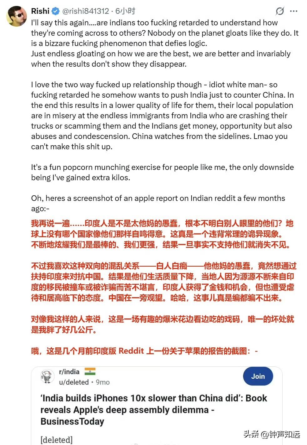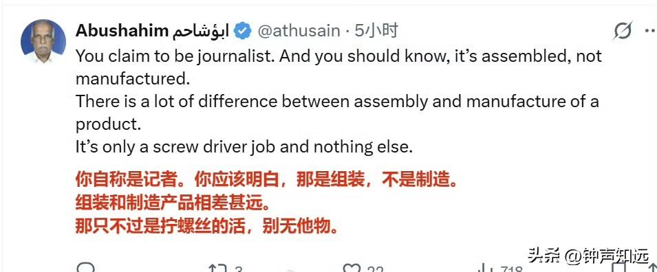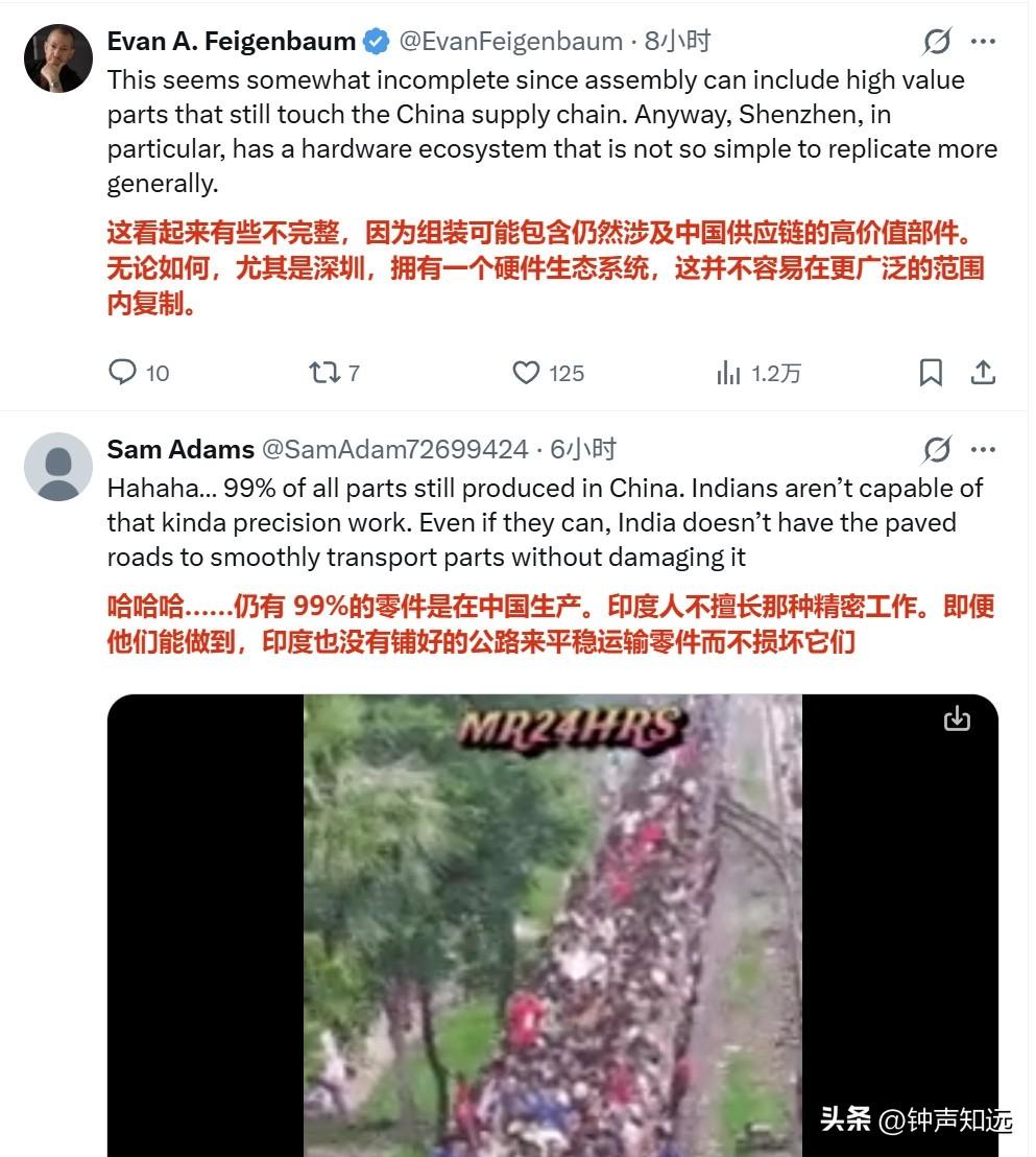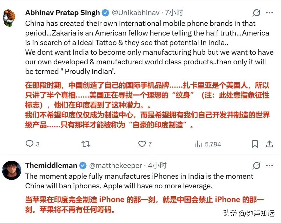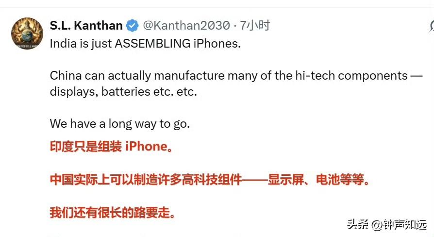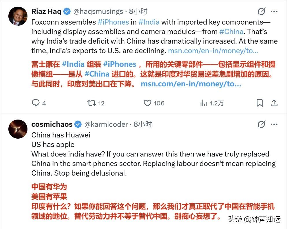 “印度4年内已取代中国,成为美国最大的智能手机制造国”印度裔记者的文章没引起“共鸣”,评论区还是有很多清醒的印度人。 2026年3月23日印度商业峰会上,印度裔美国知名记者法里德·扎卡里亚说:“印度在短短四年内取代中国,成为美国最大的智能手机制造国。你口袋里最新的 iPhone 就是在印度制造的。他们正在进行那种人们曾说只有中国才能做到的高精度制造。” 结果评论区翻车了,连印度人都不这么认为…… 有印度网友评论情绪很激烈:“我再说一遍.......印度人是不是太愚蠢,根本不明白别人眼里的他们?地球上没有哪个国家像他们那样自鸣得意。这真是一个违背常理的诡异现象。不断地炫耀我们是最棒的,我们更强,结果一旦事实不支持他们就消失不见。 不过我喜欢这种双向的混乱关系,白人竟然想通过扶持印度来对抗东大。结果是他们生活质量下降,当地人因为源源不断来自印度的移民被撞车或被诈骗而苦不堪言,印度人获得了金钱和机会,但也遭受虐待和居高临下的态度。哈哈,这事儿真是编都编不出来。 对像我这样的人来说,这是一场有趣的爆米花边看边吃的戏码,唯一的坏处就是我胖了好几公斤。” 确实如评论区所说,真实数据狠狠打脸,首先印度iPhone本土化率仅18%,60%核心零件靠中国,对美出口占优全因关税套利,97%印产iPhone专供美国,中国仍占全球手机产量67%、出口2160亿美元,印度仅300亿;印工厂良率85%,中国97%,高端Pro机型90%仍产自中国。 这个美国记者或许是为了迎合听众,结果印度人并不买账。