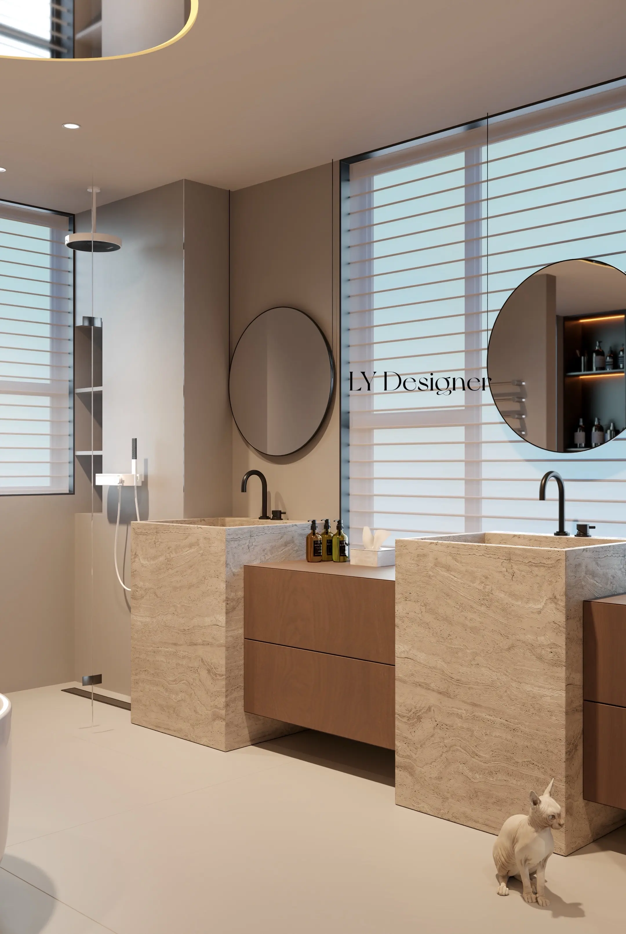 .灯光设计:无主灯+嵌入式筒灯,营造层次丰富的光影氛围,尤其圆形灯饰与镜面反射形成视觉延伸,增强空间感。