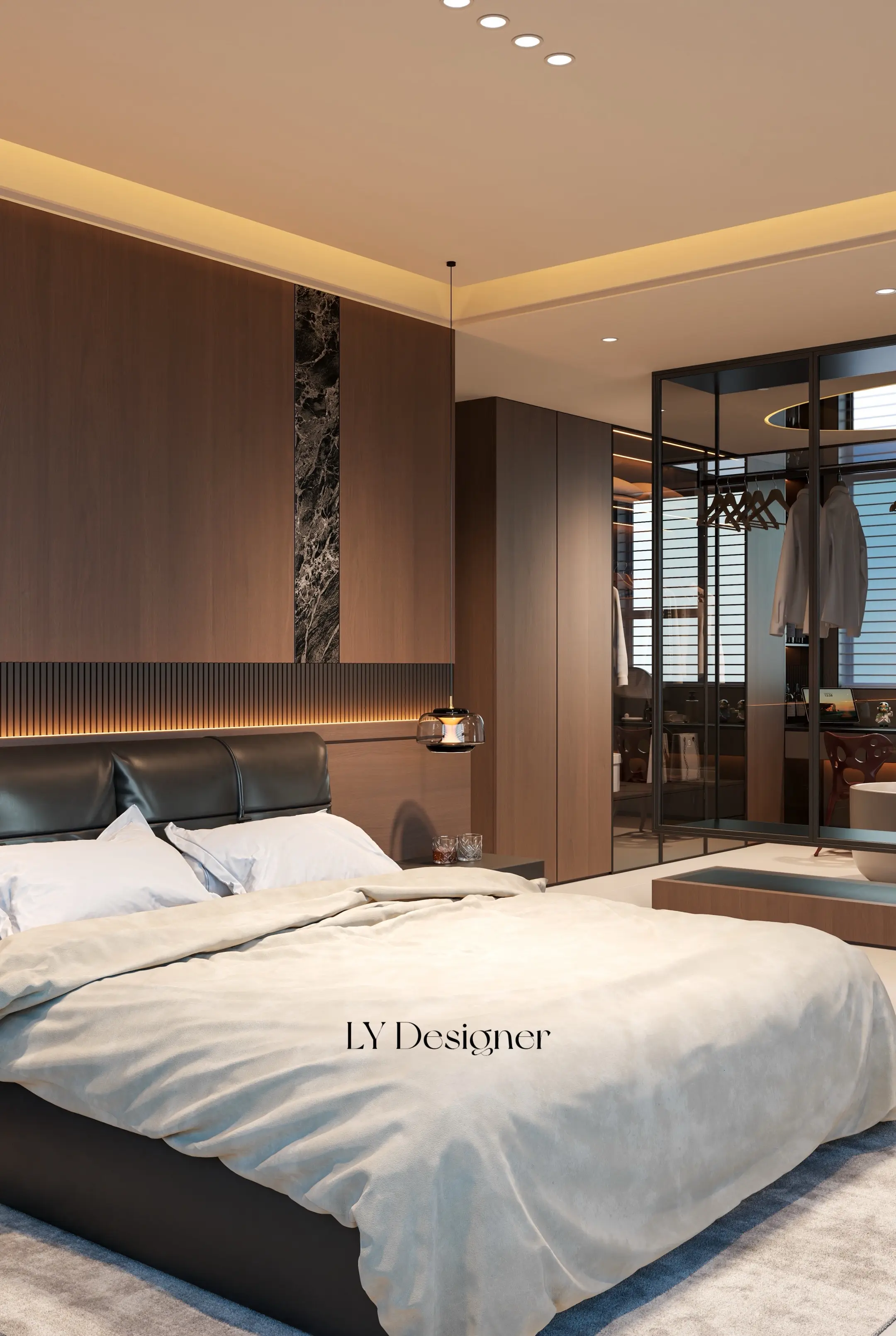 ·收纳与功能:衣帽间采用"藏露结合"设计,玻璃门+实心门搭配,既保证私密性又提升展示性;内部灯光与层板设计兼顾实用与美观。