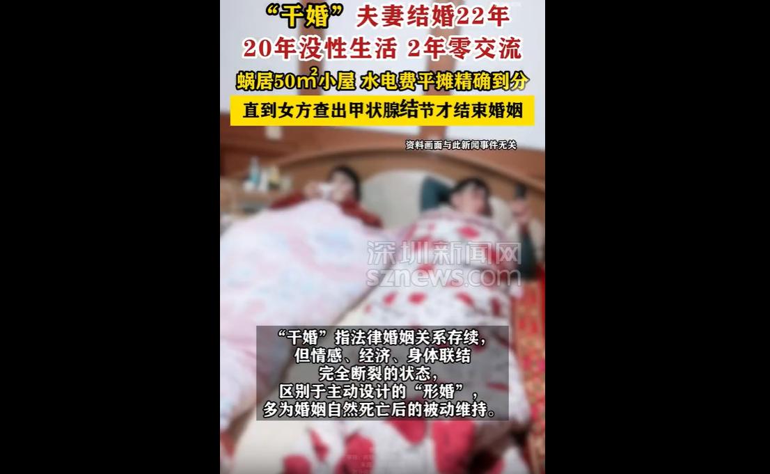 一对夫妻结婚22年,20年无性生活、2年零交流,同住50平小屋,水电费分摊精确到分厘,沦为法律存续、情感消亡的“干婚”,女方患甲状腺结节后醒悟离婚,过程平静如解除合同。 该案例引发热议,背后牵扯子女、经济、面子等因素,叠加房价压力、性别对立,让婚姻沦为冰冷契约,暗藏身心与法律隐患。 这对夫妻的生活,早已没有半分婚姻的温情,只剩法律层面的空壳。 更可悲的是,这场折磨人的关系,竟维持了22年。 女方长期压抑到患上甲状腺结节,才终于幡然醒悟,而离婚时双方的平静,更是讽刺至极,没有不舍,没有纠缠,如同解除一份无关紧要的商业合同,足以见得这段婚姻早已耗尽了最后一丝情分。 “干婚”从来不是个例,而是无数中老年婚姻的缩影。 为了孩子成长、为了面子名声、为了经济依存,多少夫妻选择硬撑,把婚姻退化成生存互助的工具,明明情感早已死亡,却非要维持表面的完整,最终在冷漠中消磨掉所有热情,甚至拖垮身心健康。 当下社会,房价压力、性别对立、信任危机,更是让婚姻一步步沦为冰冷的契约。 年轻夫妻奉行极端AA制,中老年夫妻凑合度日,大家都在精打细算地保护自己,却忘了婚姻本该是真心换真心的亲密关系。 互联网不断推送的对立内容,加深了彼此的防备,让人们不敢付出、不愿妥协,最终把婚姻变成了互相提防的战场。 婚姻的意义,从来不是维持一张证书的体面,不是精准算计的利益分摊,而是彼此陪伴、互相温暖,是烟火气里的相依,是真心相待的温暖。