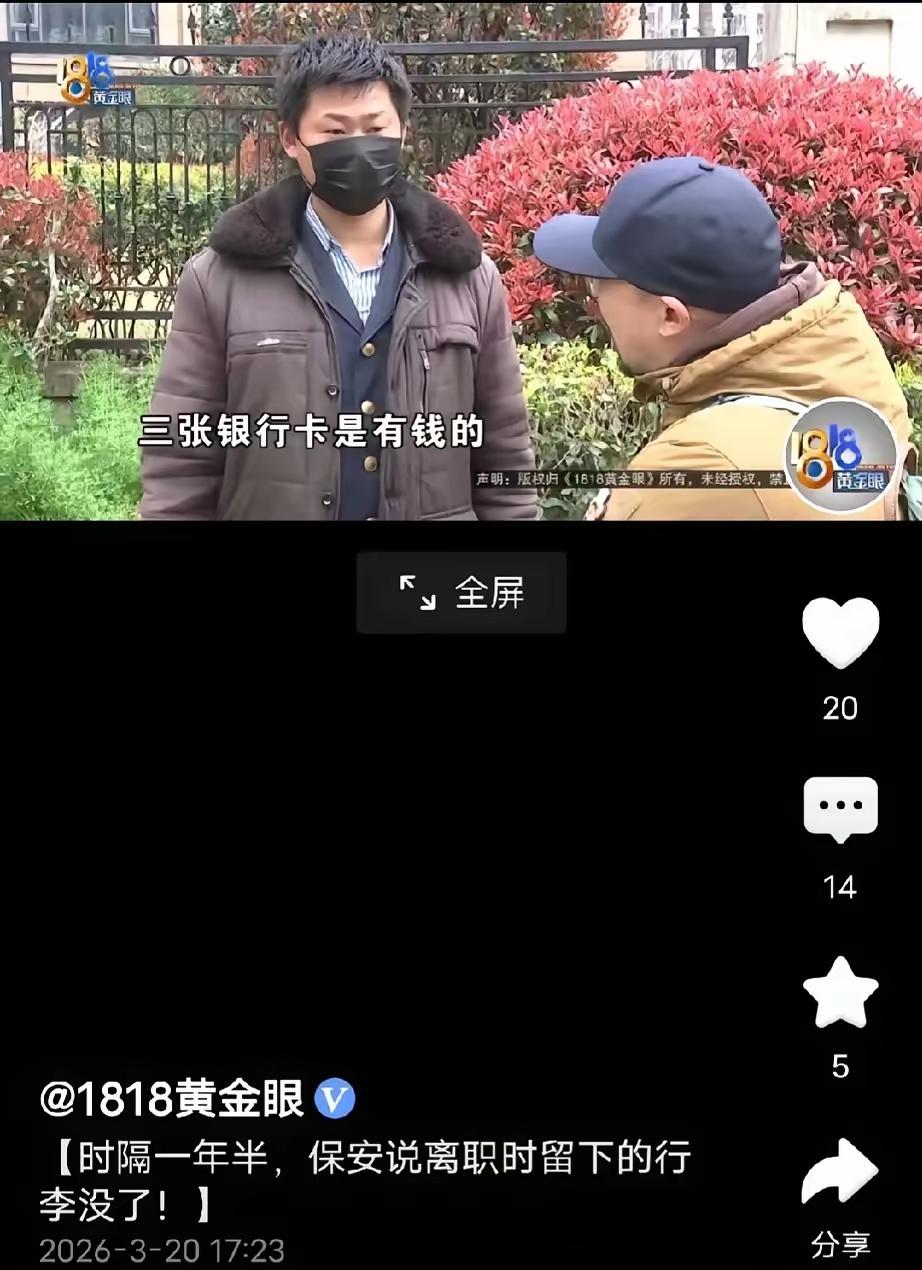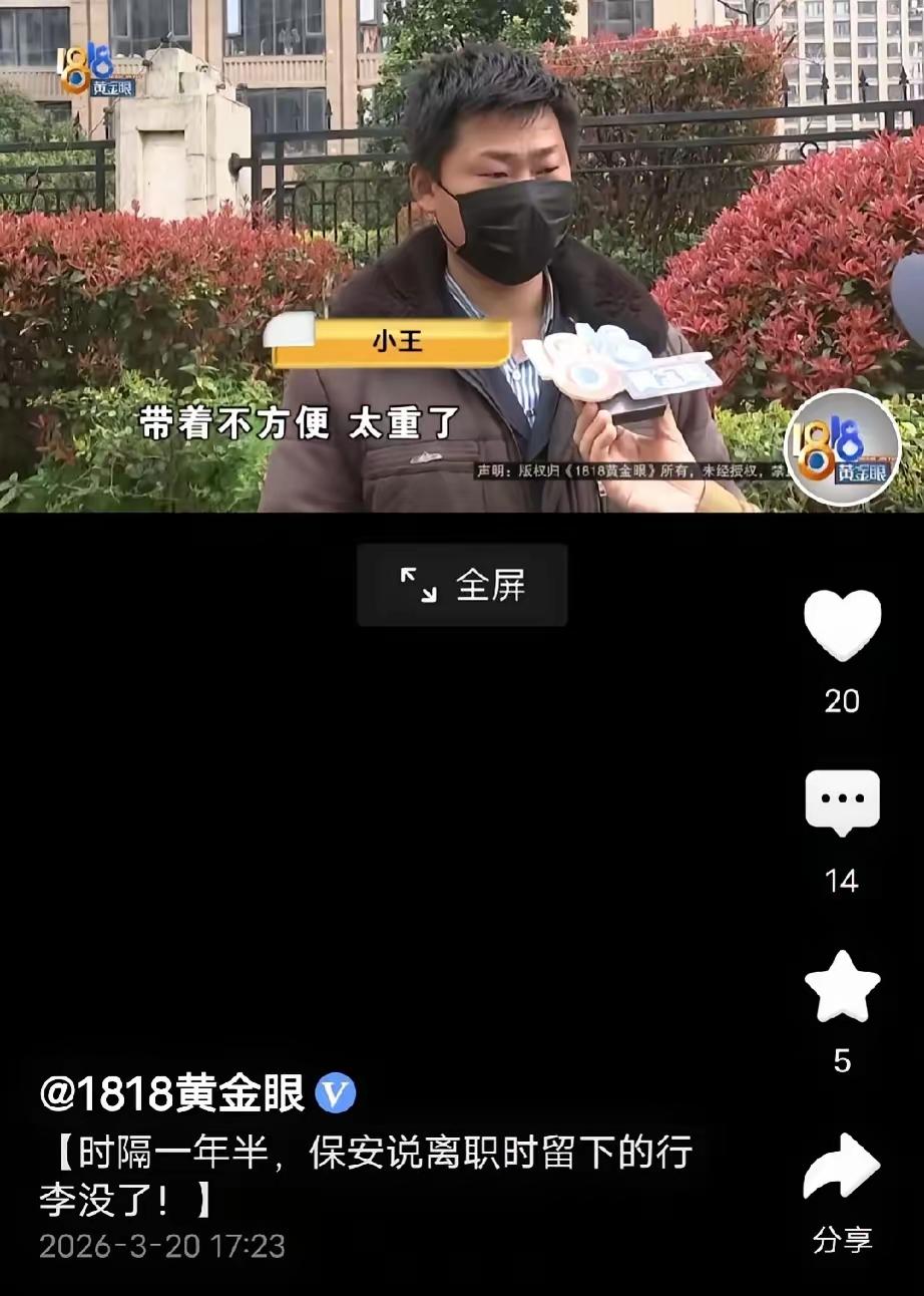 浙江杭州一男子离职后,将行李箱扔在公司宿舍不闻不问长达一年半,期间电话不接、消息不回,时隔近三年突然现身索要,行李箱早已不知所踪,男子竟找来记者维权,一番言论直接让网友炸锅。 2024年2月,小王入职杭州某小区担任保安,物业公司为员工租赁小区房屋作为宿舍,小王日常吃住均在宿舍,工作生活平稳有序。同年7月,小王因家中老人患病,当天紧急辞职返乡,因走得匆忙,仅携带少量衣物离开,临走前告知同事自己会重返岗位,并未与物业负责人正式沟通行李安置事宜。小王心存侥幸,认为宿舍安全,行李放置此处无需担心,此后便长期失联,再未主动联系公司。 2025年1月,小王到杭州办事,顺路查看宿舍,发现行李箱与背包完好摆放,便彻底放下心来,因行程匆忙未将行李带走。2025年8月,小王与同事闲聊时得知行李失踪,却因家中老人无人照料,始终未到公司处理,仅被动等待。直到2026年1月,小王才前往物业公司讨要行李,得到的答复却是公司无义务为其长期保管物品,丢失责任自负。 小王气愤不已,随即联系媒体曝光。面对记者“长期搁置物品是否自身有错”的提问,小王坦言“有点错”,却坚称公司应有制度义务帮员工保管物品。物业负责人当场驳斥:小王离职一年半,公司多次致电、发消息均无人回应,宿舍保安几经更换,行李不知是被人拿走还是清理丢弃,公司从未承诺保管,更无法律义务兜底。小王不甘示弱,反驳“物业无保管义务,也无权利丢弃”,并表示将寻求司法介入,同时补办银行卡。 此事曝光后,网友一边倒批评小王:离职后“人间蒸发”,把私人行李甩给公司近三年,丢了就道德绑架企业,既不懂情理也不懂法律。 根据**《民法典》第897条规定:保管期内,因保管人保管不善造成保管物毁损、灭失的,保管人应当承担赔偿责任;但是无偿保管人证明自己没有故意或者重大过失的,不承担赔偿责任**。本案中,双方未形成有偿保管约定,属于无偿保管关系,小王离职后长期不取回物品、刻意失联,自身存在重大过错;物业已尽通知义务,不存在故意或重大过失,依法无需承担赔偿责任,小王的诉求于法无据。 自己的财物自己不上心,却要求公司为其疏忽买单,既违背公序良俗,也不符合法律规定。职场与生活的边界,从来都需要自己守好,别把别人的情分当成应尽的本分。 对此,你怎么看?