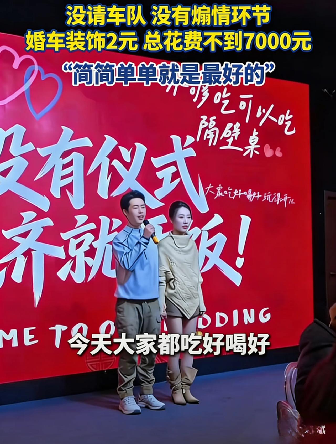 夫妻花7000元办极简婚礼,人到齐就开饭,为何全网狂赞? 2026年3月22日,河南一对90后新人袁先生与其妻子,办了一场刷新认知的极简婚礼。 现场没有豪车迎亲车队,没有高价婚庆司仪,没有冗长煽情仪式,也没有奢华舞台布置。亲朋好友到场落座,简单送上几句祝福,人齐直接开饭,全程不到二十分钟,整场婚礼所有开销加在一起,仅仅七千块。 这件事一经曝光,迅速登上热搜,刷屏全网,无数网友纷纷点赞,都说这才是过日子的婚礼。 反观当下现实,婚礼内卷越来越严重。 普通家庭办一场婚礼,动辄十几万、几十万。婚庆布置、高端跟拍、豪华车队、高档酒席,样样都要面子。不少人为了撑场面借钱操办,忙前忙后累到虚脱,折腾好几天,只剩一身疲惫,根本感受不到幸福。 而这对河南小夫妻,从一开始就想得通透,拒绝铺张,拒绝形式主义,一切从简,只图省心、实在。 根据潮新闻、津云等主流官媒实地报道,这场七千块婚礼,账目清清楚楚,一分钱都不浪费: - 婚车:自家私家车,仅花2元买喜字红绳装饰 - 化妆:新娘简约造型,花费200元 - 酒席:自家院子办8桌流水席,食材新鲜实在,合计3800元 - 摄影:大学生兼职跟拍,性价比高,900元 - 配饰布置:简单婚戒、背景布等杂项,一千多元 全部加起来,总花费不到7000元,对比当地常规婚礼,直接省下近四万元。 新郎袁先生坦言,极简婚礼是两人共同商量决定的。 他们讨厌繁琐流程,反感各种折腾人的接亲套路,不想把结婚变成一场演给外人看的面子戏。筹备只用了二十多天,不熬夜、不奔波,婚礼当天轻轻松松,没有半点疲惫。 省下的四万多块钱,他们没有乱花,全部规划用来添置家电、生活用品,实实在在经营自己的小家,把钱花在柴米油盐的日子里,而不是一次性浪费在虚头巴脑的排场中。 为什么这件事能全网圈粉? 因为戳中了普通人的痛点。 太多人被婚礼习俗、人情面子绑架,花钱受罪,身心俱疲。而这对新人,活得清醒又朴素:婚礼不需要攀比,不需要铺张,真诚祝福、简单相守,就足够了。 婚姻的本质,从来不是一场盛大的仪式,而是往后踏踏实实的朝夕相伴。 不慕浮华,不重虚名,简单纯粹,量力而行,这样的婚礼,朴素却动人,便宜却走心。 你觉得结婚该大办讲排场,还是简单实在就好?你能接受这种极简婚礼吗? 河南7000元极简婚礼 拒绝婚礼内卷 婚姻重在真心 信息来源:潮新闻、津云新闻 2026年3月综合报道 网络截图