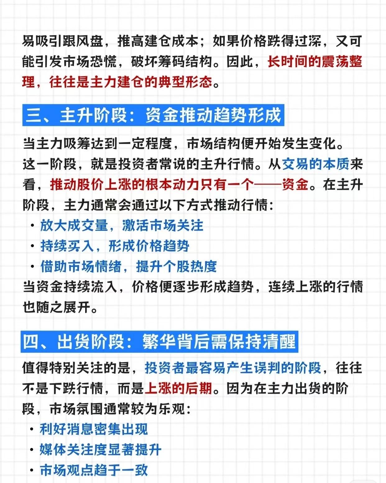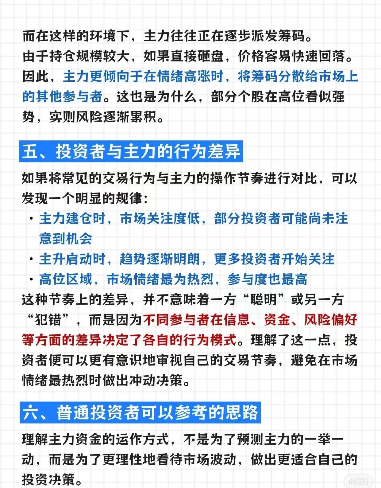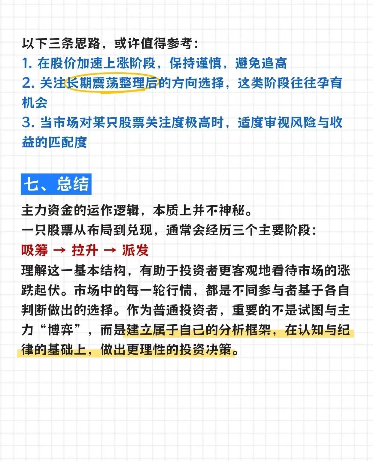 主力资金运作逻辑及普通投资者应对策略,核心要点如下: 一、主力资金运作的核心限制与阶段 1. 最大限制:资金规模机构资金量庞大(数亿、数十亿),但股票每日成交量有限,无法一次性建仓。若强行“扫货”会推高成本,因此主力通常分批吸筹、缓慢布局。 2. 阶段1:建仓期(行情最“无聊”却最关键)主力建仓时,股价常呈现长时间横盘、反复震荡、成交量忽大忽小的特征。目的是控制成本,逐步吸收市场浮动筹码(避免价格涨太快吸引跟风盘、或跌太深破坏筹码结构)。 3. 阶段2:主升期(资金推动趋势形成)吸筹足够后,主力通过放大成交量激活市场关注、持续买入形成价格趋势、借助市场情绪提升个股热度,推动股价进入连续上涨的“主升行情”。 4. 阶段3:出货期(繁华背后藏风险)投资者最易误判的阶段(上涨后期)。此时市场情绪乐观(利好密集、媒体关注、观点一致),但主力借情绪高涨分散派发筹码(若直接砸盘会快速回落)。高位“强势”可能是风险累积的信号。 二、投资者与主力的行为差异 - 建仓时:市场关注度低,部分投资者忽略机会; - 主升启动时:趋势明朗,更多投资者开始关注; - 高位区域:市场情绪最热烈,参与度最高。 这种差异源于信息、资金、风险偏好的不同,而非“谁聪明/犯错”。理解这点可避免在市场情绪顶峰冲动决策。 三、普通投资者的参考思路 1. 股价加速上涨时,保持谨慎,避免追高; 2. 关注长期震荡整理后的方向选择(这类阶段往往孕育机会); 3. 当个股关注度极高时,适度审视风险与收益的匹配度。 四、总结:主力运作的底层逻辑 主力资金运作本质是“吸筹→拉升→派发”的三阶段循环。普通投资者无需预测主力动作,而是要建立自己的分析框架,在认知与纪律的基础上做理性决策(避免与主力博弈,客观看待涨跌)。 简言之,主力运作受资金规模限制,分“建仓-主升-出货”三阶段;投资者需理解节奏差异,用理性策略应对,而非盲目跟风。