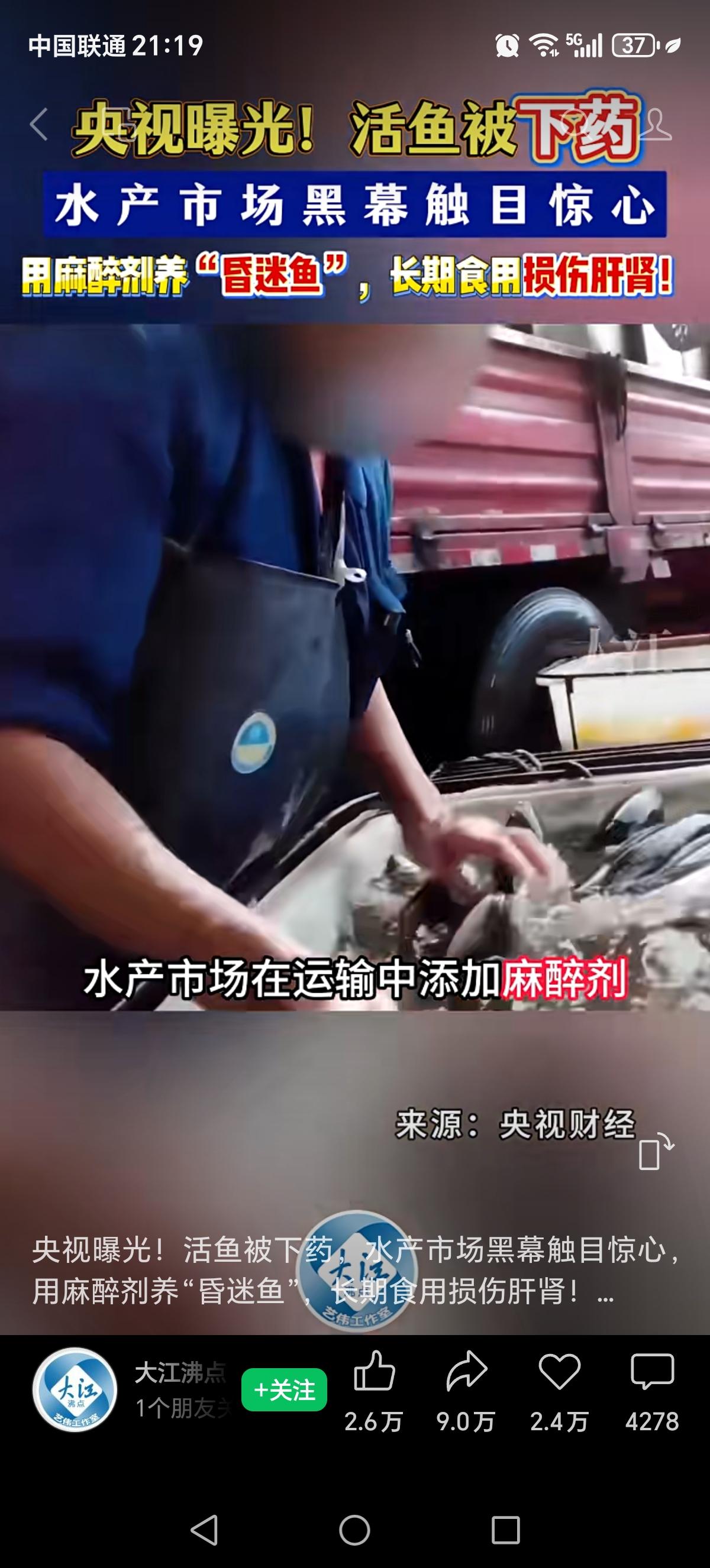 央视报道:商贩靠三无麻醉剂,休眠活鱼保鲜,而且狂言,不放心可以不吃! 令我们伤脑筋的是:我们生活在城里,连鱼也不吃,那么还吃什么呀! 商贩抓住了我们的软肋,所以敢于狂言:不放心可以不吃! 令人担忧的是:三无麻醉剂可对呼吸系统,循环系统,肝脏,肾脏,心脏等造成危害。 吃鱼吃得越多,危害就越大! 鱼也不能吃了! 这是怎么回事啊!