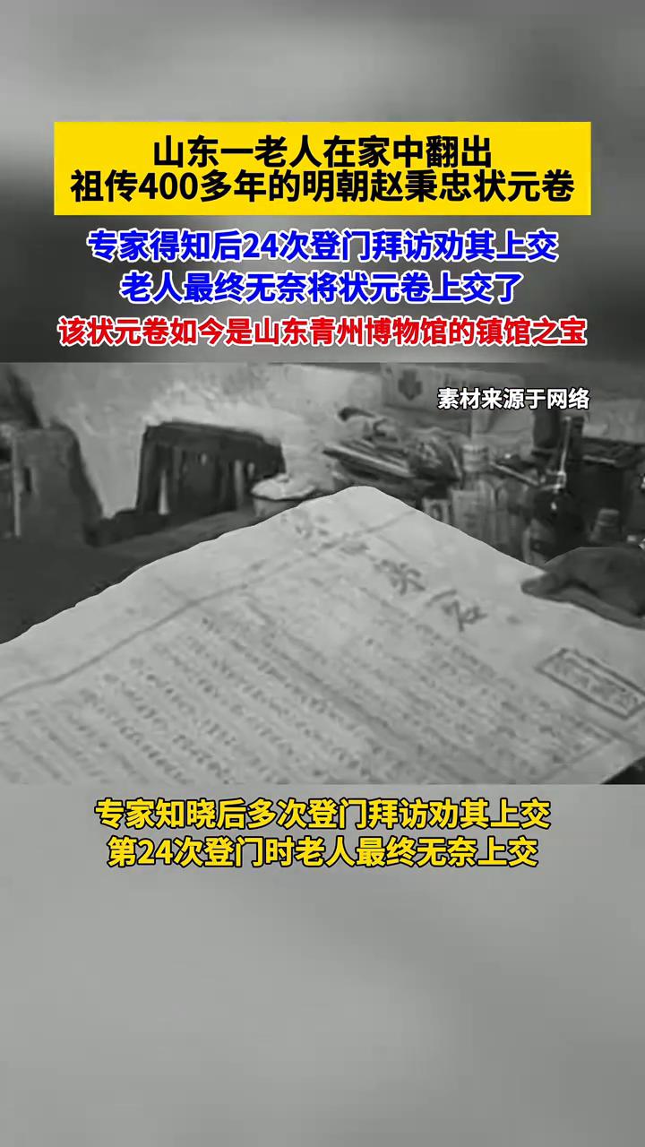 山东一老人在家中翻出祖传400多年的明朝赵秉忠状元卷,专家得知后24次登门拜访劝其上交,老人最终无奈将状元卷上交了。 该状元卷如今是山东青州博物馆的镇馆之宝,专家知晓后多次登门拜访劝其上交,第24次登门时老人最终无奈上交。 山东青州一位老人在家中翻出来了一份传了400多年的状元试卷,这是明朝赵秉忠的状元卷,距今约420年,价值连城。