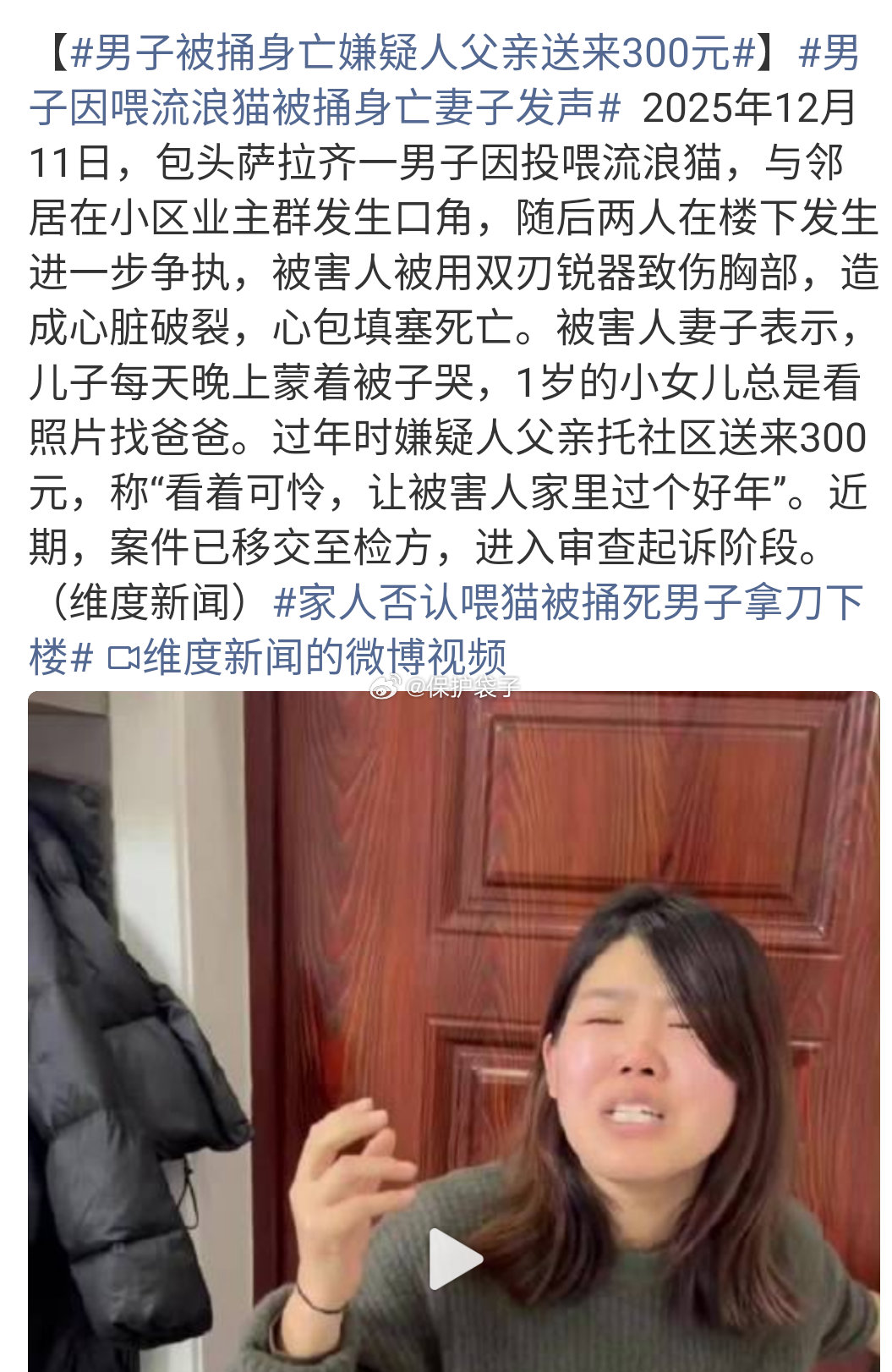 家人否认喂猫被捅死男子拿刀下楼这题目堪比甲骨文还难阅读。简而言之:住户常喂流浪猫和他人积累的矛盾爆发被人咔了。 物业还是没做好,流浪动物属于名录里的得送动物园,普通的得抓来做绝育,实在想投喂的要做个专门的投喂点。 爱心有的少有的多有的泛滥,这是每个人的自 由,但不能因此造成他人的麻烦。有些爱心恰当,是值得别人高看一眼。有些过多了容易被当做“圣母道德”BIAO。 生活不容易,无论是戾气过多还是爱心过多的,敬而远之。袋子时评
