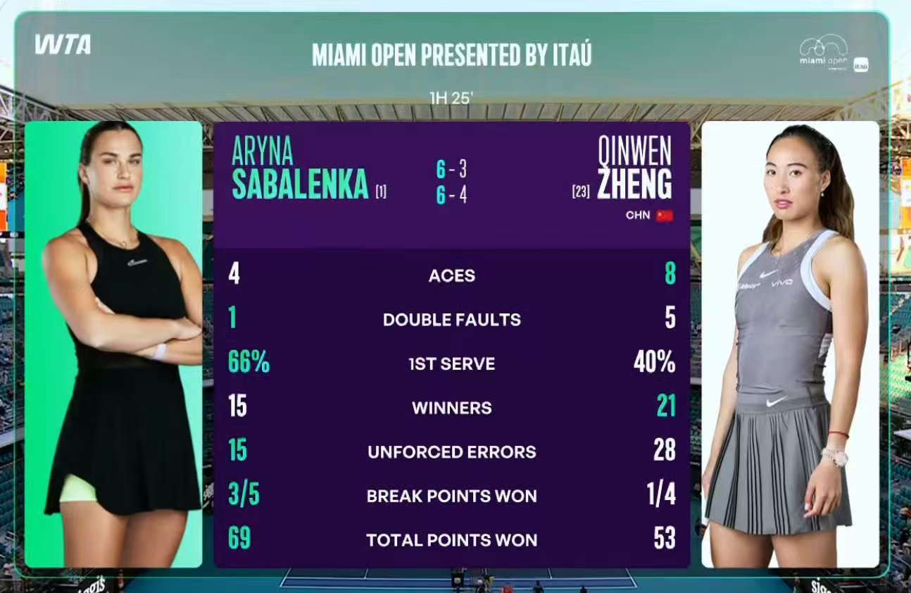 还是创造出了4个破发机会的,制胜分还比对手多,反手本站也持续有出色发挥。但超强攻击力的另一面就是很低的一发成功率,已经比较高的UE。郑钦文0比2萨巴伦卡