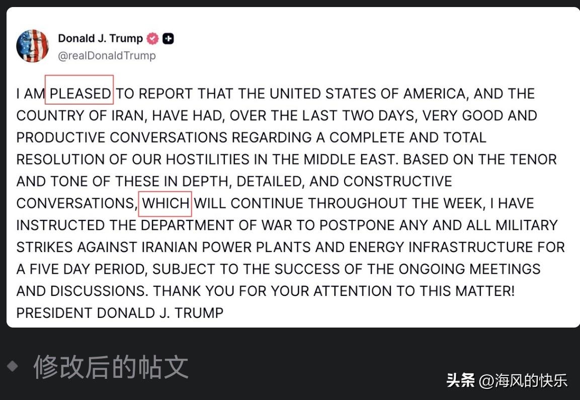 涉伊朗重磅帖文接连出现语法错误,特朗普遭网友怒怼 据外媒报道美以伊战争仍在持续,美国总统特朗普3月23日在社交媒体“真相社交”上发文宣布了一个重磅消息:美伊谈判取得进展,他将推迟对伊朗一些打击行动。 特朗普发文说:“我很高兴地宣布,过去两天,美国和伊朗就彻底解决我们在中东的敌对行动进行了非常良好且富有成效的对话。鉴于这些深入、详细和建设性的对话的基调和氛围,以及本周将继续进行的对话,我已经指示美国战争部暂停对伊朗发电厂和能源基础设施的一切军事打击,为期五天,但前提是正在进行的会谈和讨论取得成功。感谢您对此事的关注!唐纳德·J·特朗普总统。” 不过,在这么重要的帖文中,特朗普接连犯了两个语法错误,将“PLEASED”写成了“PLEASE”,同时还将“WHICH”写成了“WITCH”。一些美国网友都看不下去了,怒骂特朗普“弱智”。 此外,对于特朗普的帖文,伊朗外交部回应说,与美国方面“不存在对话”。美国总统的相关表态旨在为降低能源价格并争取实施其军事计划的时间。 一位伊朗高级安全官员当天称,目前没有与美国方面进行谈判,也不会进行谈判。特朗普在社交媒体上的相关言论可能为“心理战”。该官员同时表示,伊朗方面将持续对美以军事行动进行广泛防御及回应。