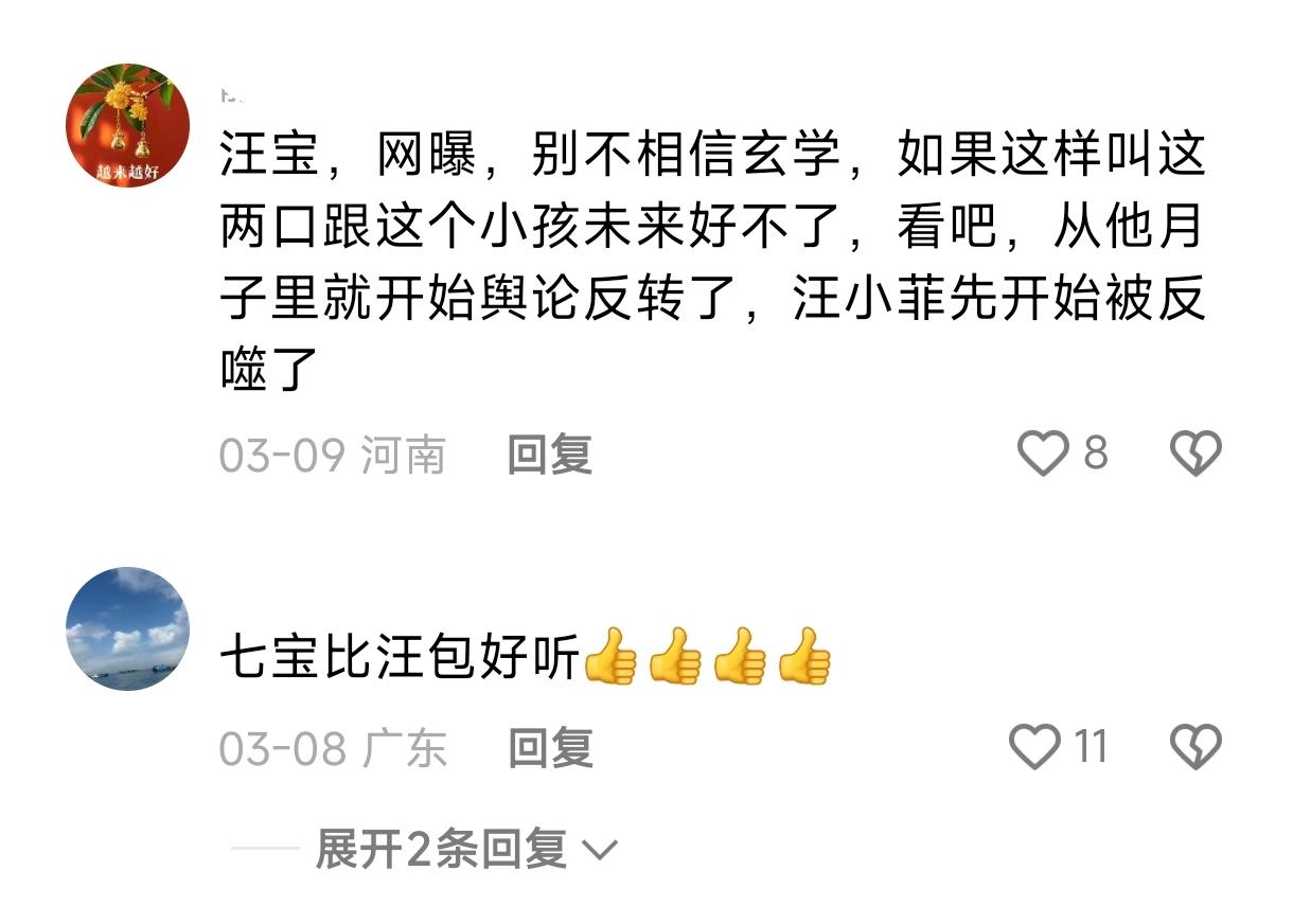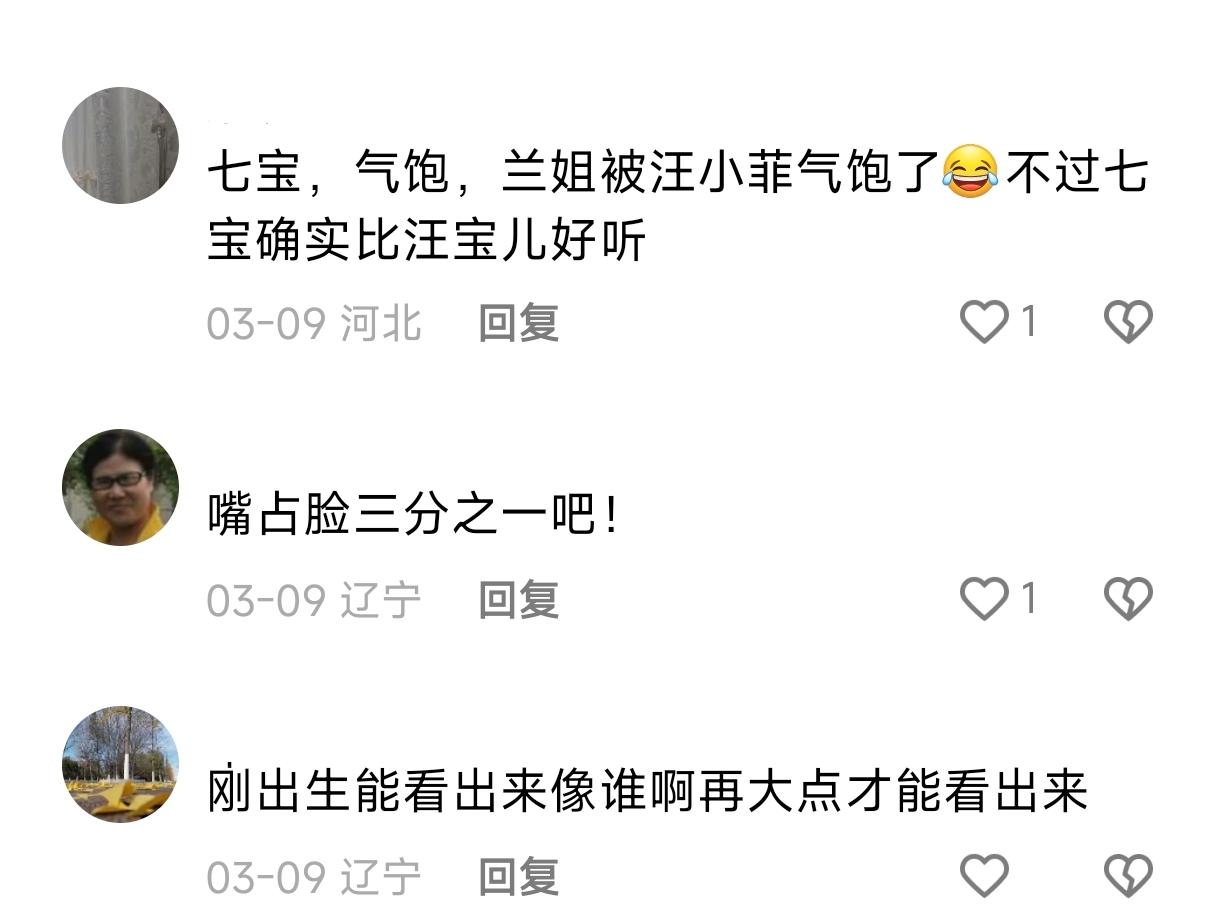 马筱梅直播间说汪宝眼睛嘴巴像她,却被网友吐槽嘴巴可别像她太大!更多网友劝她把汪宝改掉,寓意不好,已经开始被反噬了! 网友留言: 眼睛像你好看,嘴巴像不好看,你嘴巴太大啦。 汪宝,网曝,别不相信玄学,如果这样叫这两口跟这个小孩未来好不了,看吧,从她月子里就开始舆论反转了,汪小菲先开始被反噬了。 汪宝 ,旺家 ,旺爸, 旺妈, 将来还旺妻。旺旺旺, 一路顺风, 顺水, 顺人生。 听老人话没错,叫汪宝儿不妥,那两个孩子会吃醋,叫七宝听起来喜庆,而且还是初七生的,所以说格局真的很重要。 小七宝好。七的寓意是代表财运旺。七宝自带富贵面相。还是兰姐起的七宝名字好听,更有寓意。 七宝,气饱,兰姐被汪小菲气饱了,不过七宝确实比汪宝儿好听 ! 其实,我认为孩子叫什么倒是其次,马筱梅应该少在直播说家里事,少曝光孩子,没有炒作哪来这么多舆论?安安静静过日子才是最重要的。 也希望马筱梅珍惜婆婆对你的爱,张兰是我们女人的模范,希望你能接励兰姐的善良和优秀,让大家称赞得人心!