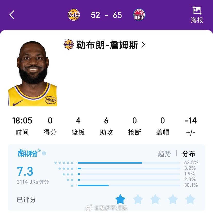 如果评价上半场的詹姆斯?出战18分钟,5投0中未得分,正负值-14湖人vs活塞