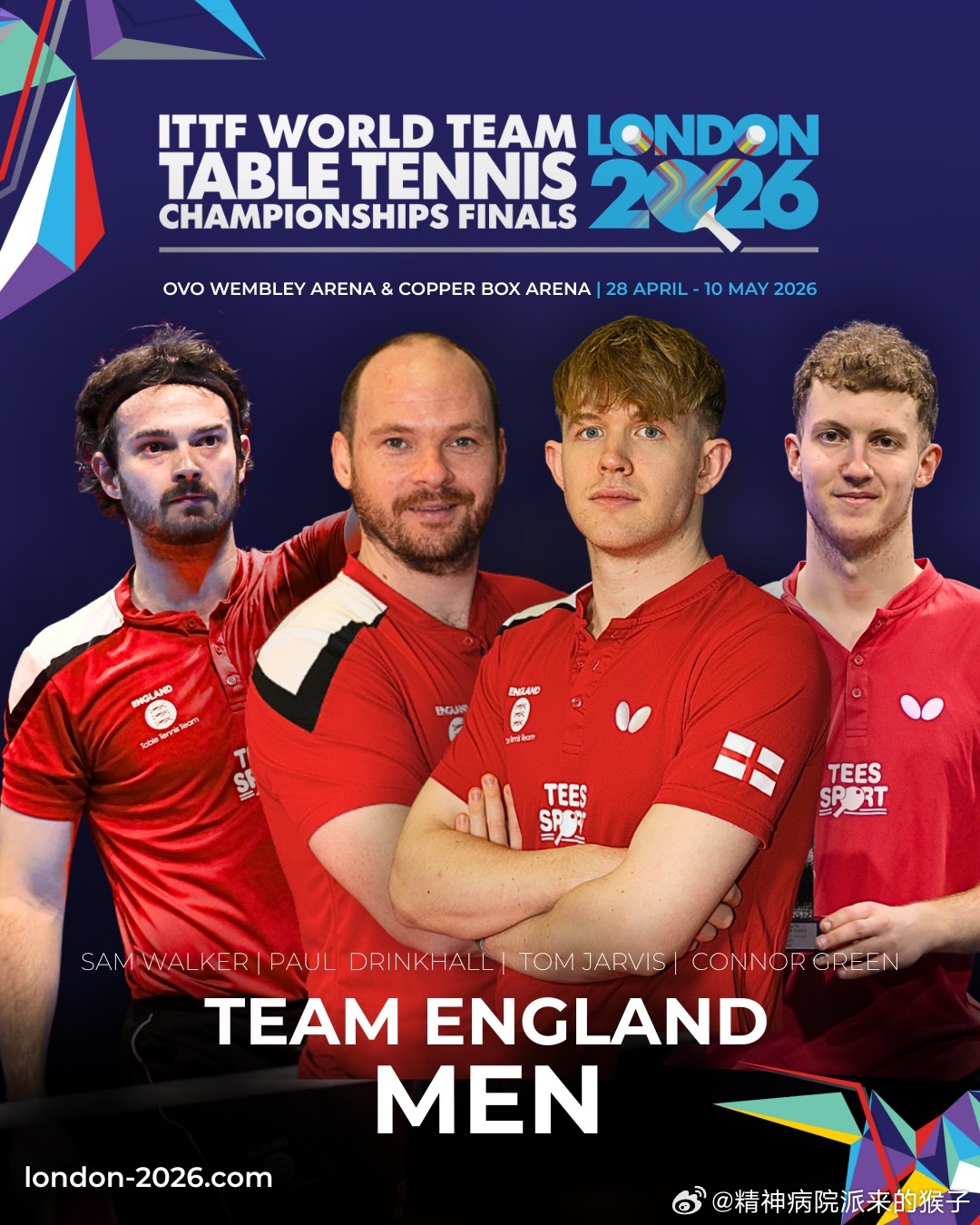 英格兰队2026年伦敦团体世乒赛阵容🏴男团:贾维斯、金