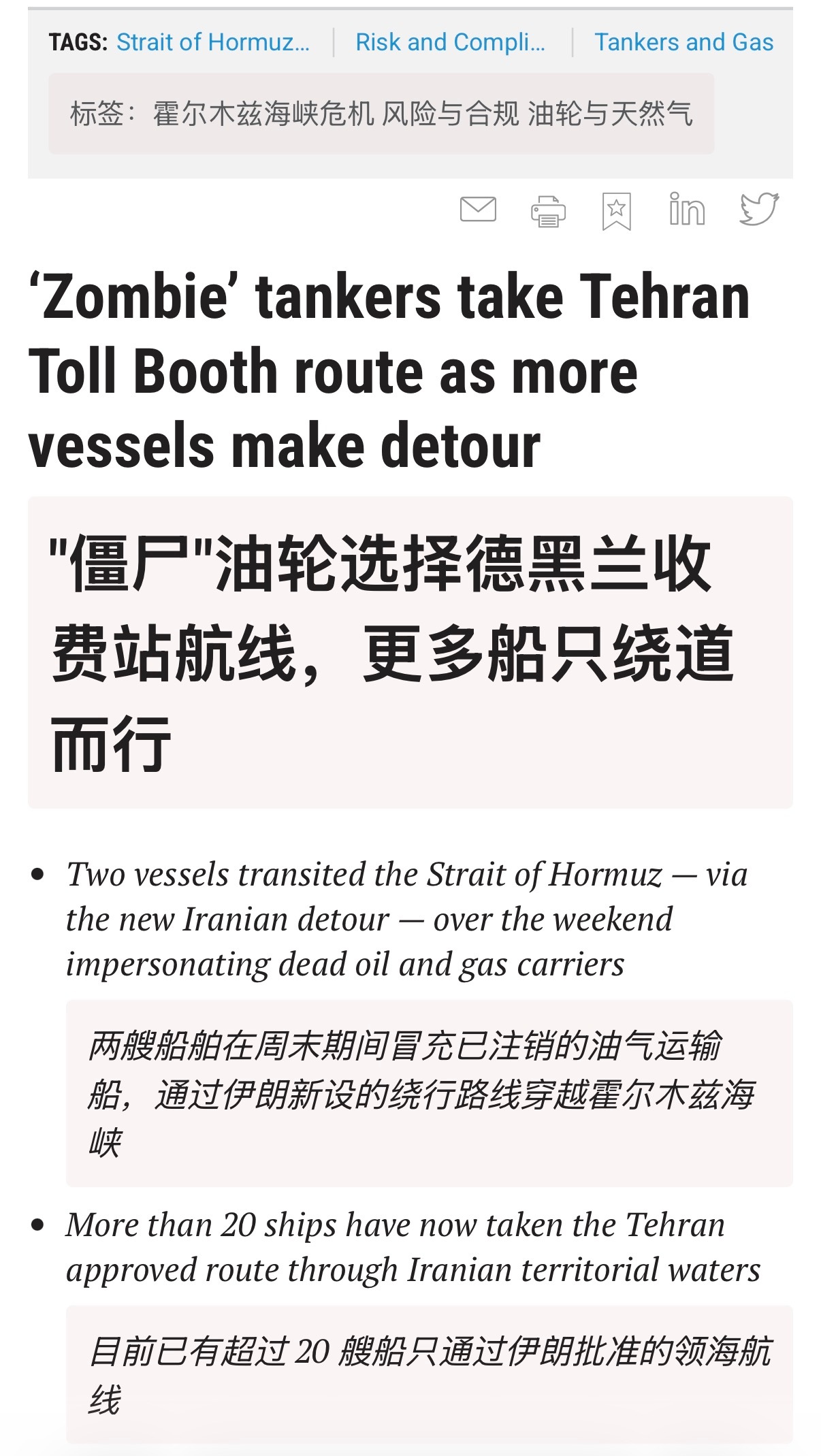 🔻劳氏情报数据显示,霍尔木兹海峡的船舶通行速度在上周末有所加快,自周五以来至少有 16 艘船只通过这一咽喉要道。其中 12 艘船只选择了穿越伊朗领海的新航线。🔻越来越多的船只正被引导进入伊朗领海,穿越霍尔木兹海峡的航线正经历所谓的“德黑兰收费站”现象,据信革命卫队在此核查船只信息,并在某些情况下收取通行费。截至目前,已有超过 20 艘载重吨位超过 1 万吨的船舶选择绕行,航线经过伊朗的格什姆岛和拉腊克岛之间。其中包括两艘“僵尸”油轮,它们冒用已注销船只的身份通过了该海域。🔻劳氏称:“据了解,至少有两艘通过该海峡的船舶已支付费用以换取安全通行,其中一笔费用据称约为 200 万美元。”🔻《劳氏日报》是全球历史最悠久的连续发行期刊之一,早在 1734 年就开始在伦敦每周发布航运新闻。该报持续每日发行至 2013 年(当年出版了最后一期印刷版),现以数字形式发行。伊朗称美为操纵市场散布假新闻以色列总理称将继续袭击伊朗黎巴嫩海外新鲜事中东现场直击