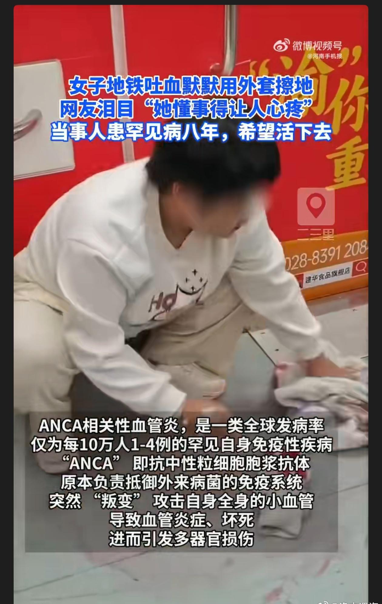 女孩地铁吐血用外套擦地让人心疼胡心瑶身患罕见病,即便吐血虚弱,仍顾及他人感受,用外套擦地。8年180多万的治疗费用,家庭无力承担,她靠写小说盼稿费治病,展现出顽强求生的意志。希望社会能给予她更多关爱与帮助,助她渡过难关。