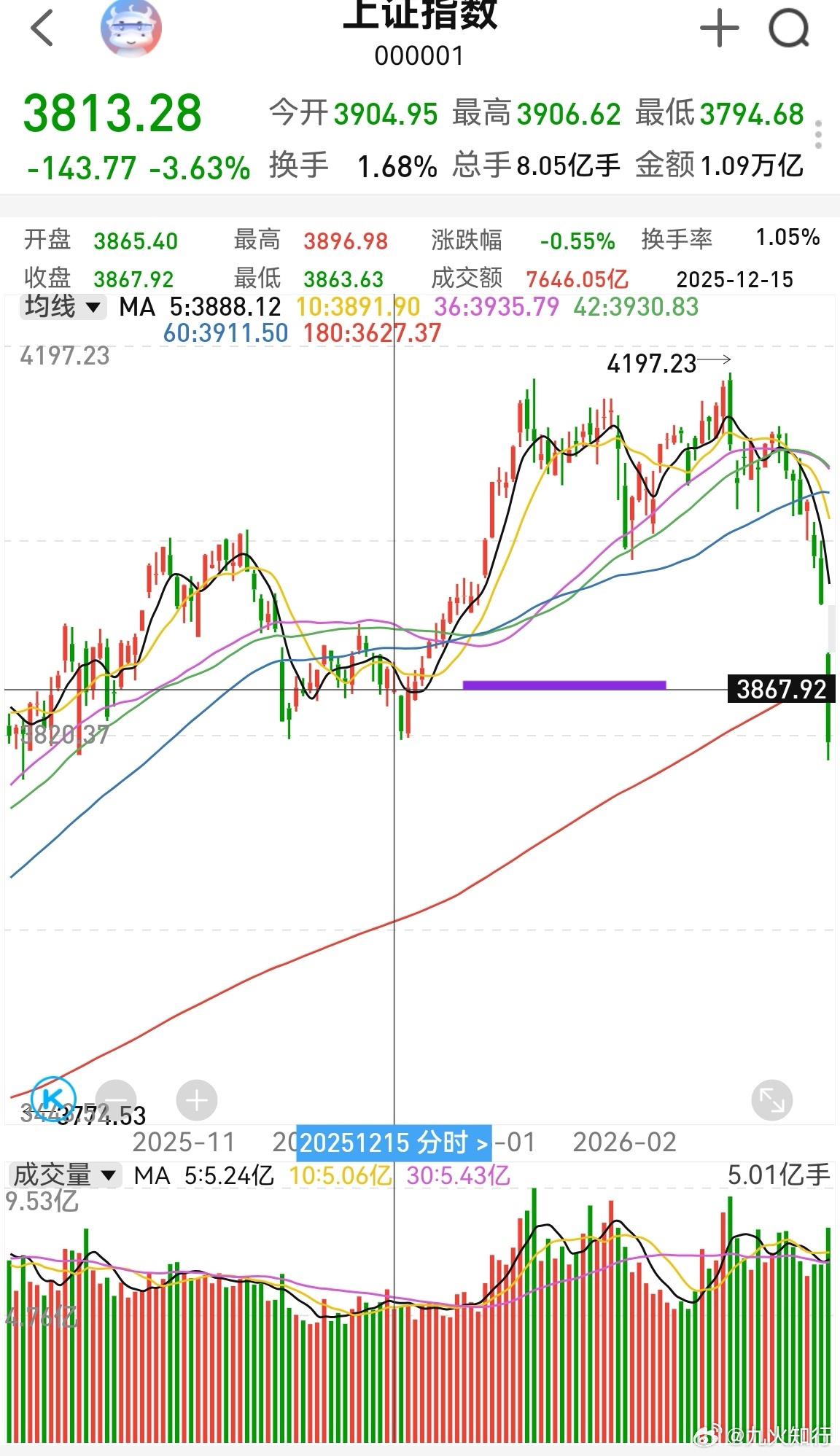 前面3855附近是一个密集支撑位,跌破了就成了压力位。所以今天3855—3865就是压力了。