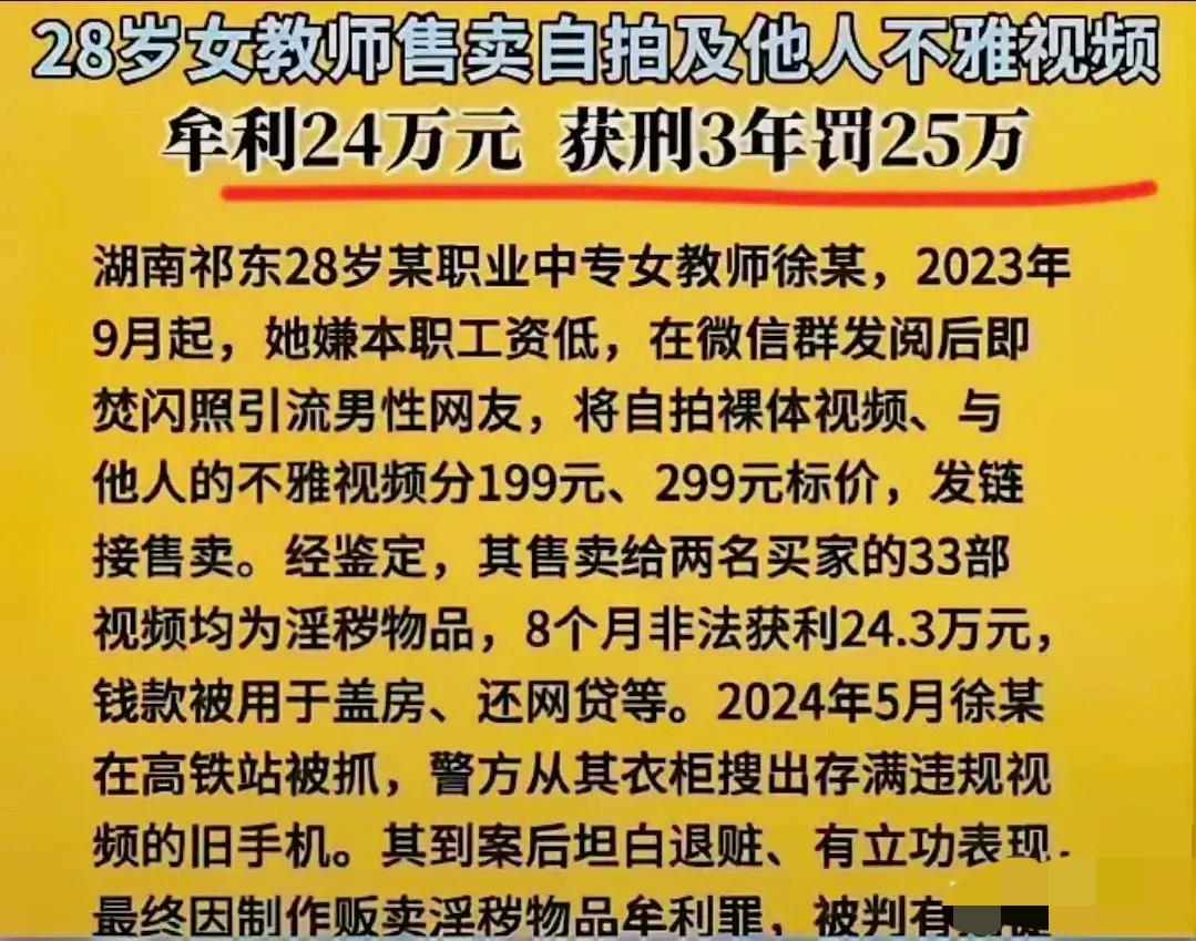 太唏嘘了!祁东98年女教师徐某这波操作,直接把一手好牌打得稀碎,看似赚了快钱,实则赔上了整个人生!手握教师编制本是旁人羡慕的安稳,却因贪念钻空子,靠闪照引流卖自制不雅视频,8个月捞24万,殊不知这钱全是烫手山芋,最终换来3年缓刑25万罚金,编制没了还留终身案底,连子女政审都受影响,这笔账亏到骨子里! 别觉得网络交易隐蔽就可肆意妄为,资金流、聊天记录全是铁证,更别说教师本就是守底线的职业,师德和法律从来都是双重红线,碰哪条都是自毁前程。她的下场根本不是偶然,而是把侥幸当底气,把职业底线当摆设的必然结果,所谓的快钱,不过是命运提前标好价格的陷阱。 说到底,体面的人生从不是靠走捷径换来的,越是看似安稳的路,越要守好内心的规矩。你觉得当下还有哪些看似捷径实则深坑的赚钱方式?评论区聊聊~