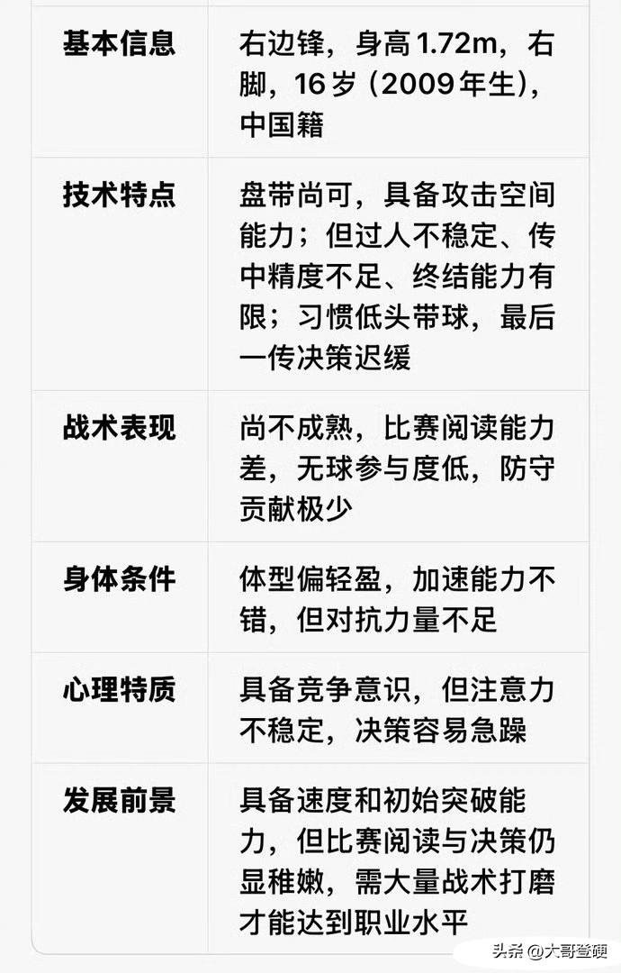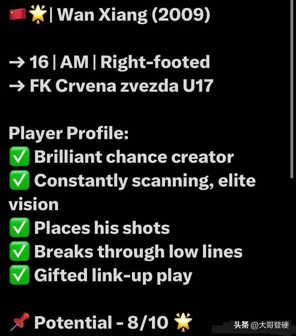 现实就摆在这儿!万项比小邝、老二的脚下技术更细腻,比他俩踢的更合理,差距会越拉越打[大金牙] 近日,知名海外足球博主“我也在西班牙”先后发布了两篇来自国外的专业球探报告,一个是关于万项的球探报告,一个是关于小邝的球探报告[握手] 其实不用看球探报告,但凡有过专业训练经历的球迷,一眼就能看出来,目前万项的运动姿态,持球向前推进的感觉,传球分球的合理性、适配场上位置的多样性等多个方面,是要比小邝和老二好的[思考] 这两份球探报告,也从一个侧面反映出,长期专业系统训练的重要性⚠️ 客观而言,万项与那些西班牙留洋小将们的核心区别在于,从足球小将离开后,万项进入当时的大连星辉,再跟随大连星辉去到湖北,始终接受的是专业系统科学的训练,这些年每一天、每一周、每个月、每个阶段,都需要完成很系统的训练计划,这些年累积起来,就是现在呈现出来的样子[奋斗] 而那些从清华附中中途离开,选择去西班牙的小将们,期间经历了流浪苏州,去到西班牙之后大多数没有第一时间衔接上球队,有的去到西班牙长时间办不下来参赛证,他们的训练实际上是没有保障可言,也是没有科学系统的训练计划的[吃瓜群众] 如果没记错的话!当初去西班牙的小将家长里面,有曾经直播过在街头颠球的,有曾经直播过在阳台练球的…… 换言之,足球青训是一个漫长的过程,每一个阶段都需要有清晰的训练计划和训练目标,尤为重要的是,在需要踏踏实实打磨基本功的“黄金敏感期”,切记不能耽误了,一旦错过了这个“黄金敏感期”,有些东西是不可逆的,这是“放之四海而皆准”的足球青训规律[加油] 这就是为什么万项只要一拿球向前推进,或者摆脱防守,亦或者是传球,普通球迷也能看出来很丝滑的感觉,而小邝也好,老二也好,子杰、凯源也罢,拿到球之后接下来的连接动作,看起来给人感觉怪怪的,总会给人一种磕磕绊绊的感觉,甚至连一些很普通的停球,传球,防守等动作,看起来也是别别扭扭的,跟有些野球场景里的动作很相似[吃瓜群众] 虽然万项打的所谓国际比赛场数,远没有那些留洋西班牙的小将多,但万项目前在比赛中呈现出来的感觉,是好于那些留洋西班牙的小将们[强] 值得一提的是,因为有科学系统的训练作为保障,万项在最基础的体能方面,也是要好于那些留洋西班牙的小将们[思考] 说白了,就是万项所经历的长期科学系统训练,为万项的未来夯实了基础,可以确保职业生涯的下限;而留洋西班牙那些小将缺乏了这些最基础的东西,除了流量,在足球上面其实已经没有兜底的东西了,而且越接近成年队,二者之间的差距就会放大的越明显[得意] 因此,万项目前除了在球星卡、签名球衣、炒作等方面,是不如那些留洋西班牙的,但在足球技艺和未来上升空间等方面,跟他们已经不在一个段位上了,情况就是这么个情况,你们品,你们细品……