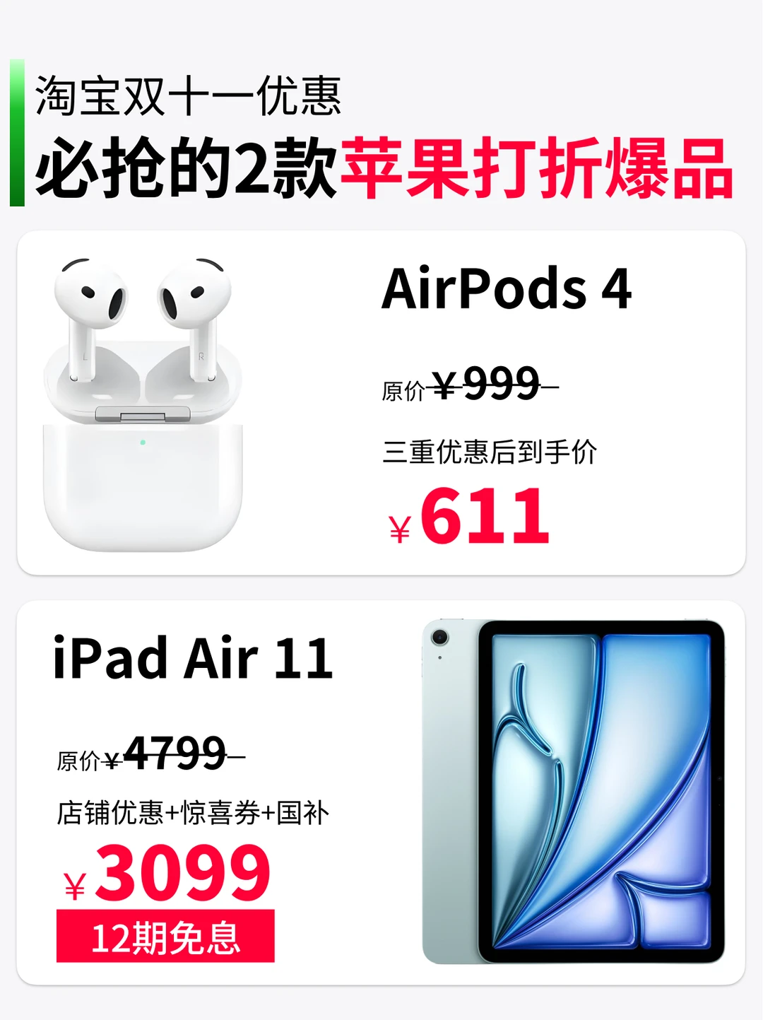 💟iPad Air 11 英寸,原价4799元,淘宝3099 元到手!直接降了1700!还支持12期免息。