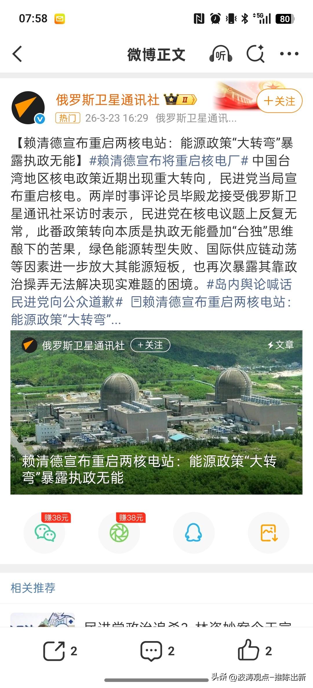 6岁的反核天才儿童呢? 赖清德突然抛出重启台湾核二、核三厂言论,岛内舆论直指其亲手推翻民进党“反核”神主牌。“反核”与“台独”并列,是民进党长期标榜、写入党纲的核心政治主张,如今却因现实压力彻底破功。 民进党左右互搏,把6岁的儿童忽悠瘸了!