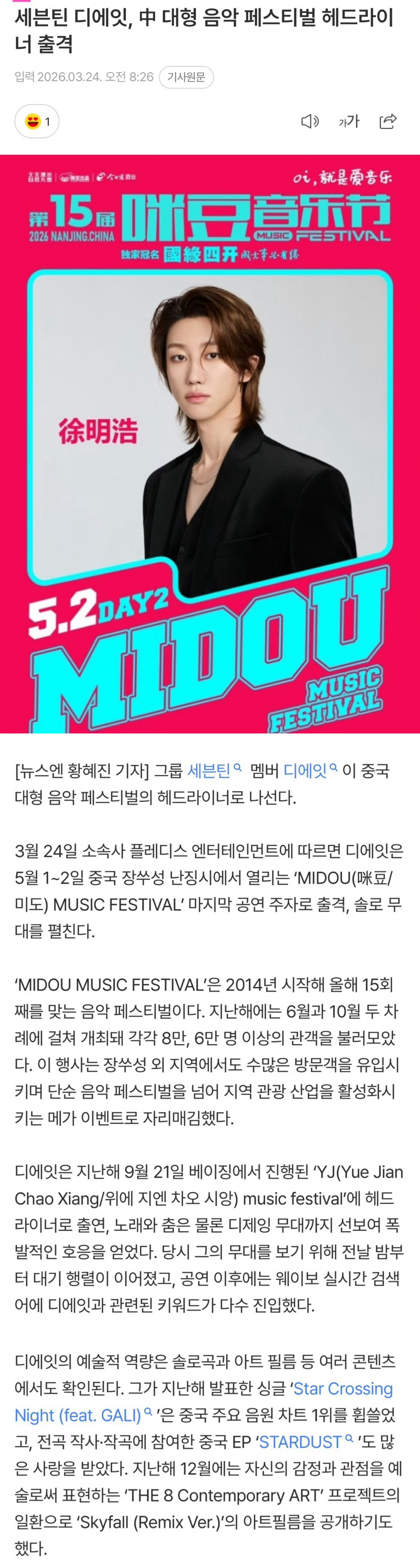 韩网报道徐明浩将压轴登场咪豆音乐节!期待舞台