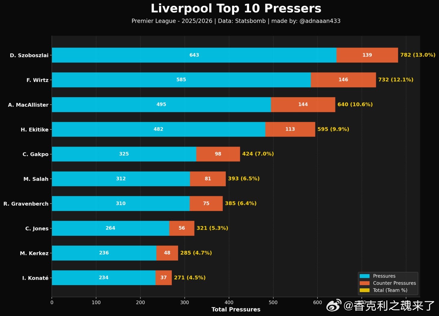 利物浦高压逼抢贡献排名索博第一 维尔茨第二 麦卡第三 埃基蒂克第四