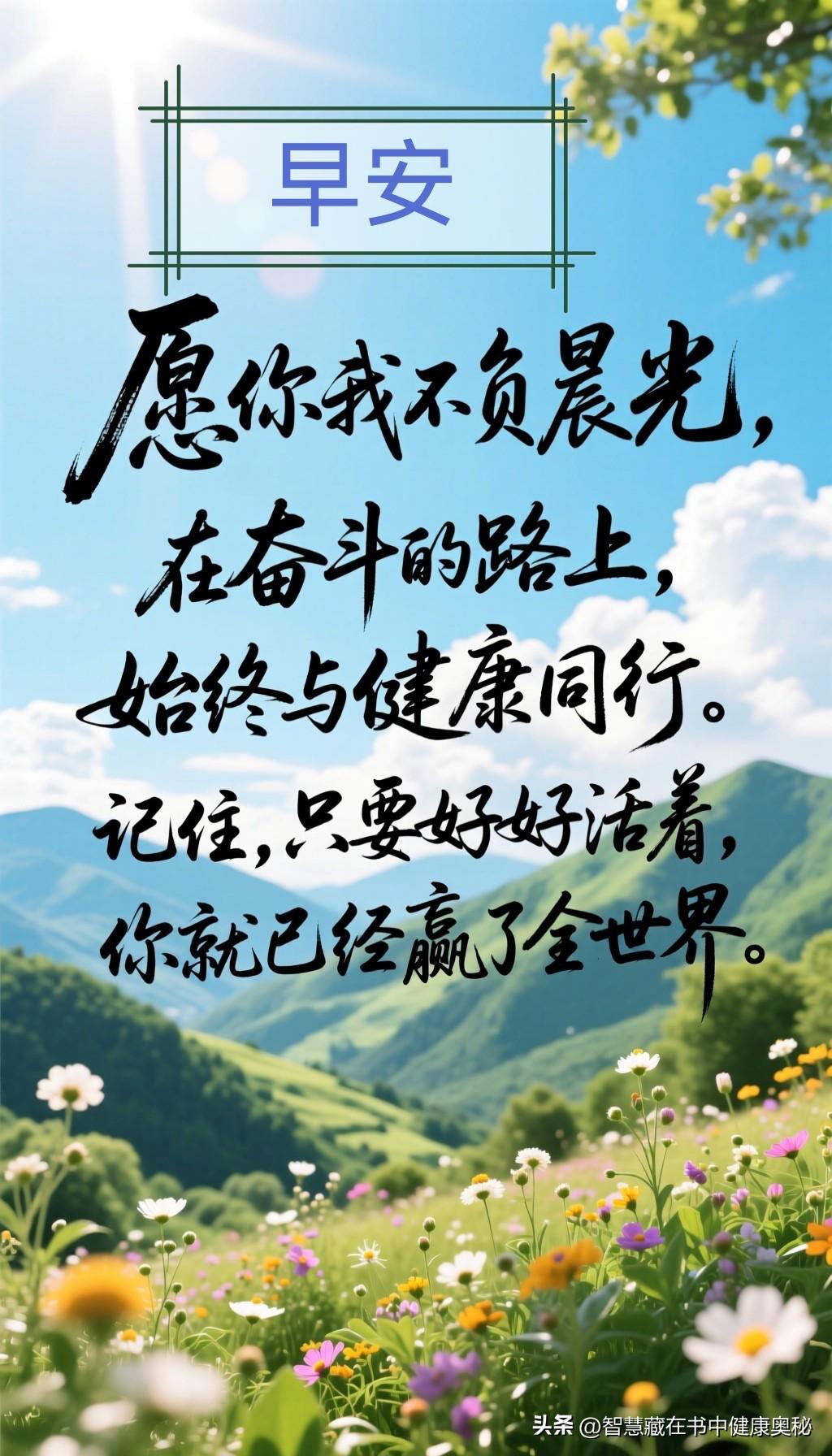 清晨的微光穿透窗帘,新的一天如期而至。早安! 在这匆忙的世间,我们往往忙着追逐名利、计较得失,却常常忽略了一个最朴素的真理:健康的活着,就是最大的赢家。 人生是一场漫长的马拉松,而非短暂的百米冲刺。我们总以为年轻是资本,可以肆意透支身体去换取财富;总以为成功是终点,可以牺牲健康去搭建通往巅峰的阶梯。然而,命运早已标好了价格。当病痛来袭,所有的豪言壮语都变得苍白无力,所有的荣华富贵都成了过眼云烟。在 ICU 的病床前,你才会猛然惊醒:原来,拥有一个能自由呼吸、能奔跑跳跃的身体,才是这辈子最昂贵的奢侈品。 真正的赢家,不是账户里有多少数字,而是每天醒来时神清气爽,吃饭香甜,睡眠安稳。健康是"1",财富、地位、情感都是后面的"0"。 没有了前面的"1",后面再多的"0"也毫无意义。不要等到失去了才懂得珍惜,不要躺在病榻上才后悔莫及。 从今天起,请把“爱自己”落到实处。少熬一次夜,多跑一公里;少点一份外卖,多吃一顿家常饭。这不是对生活的妥协,而是对生命的敬畏。无论外界如何风云变幻,只要身体硬朗,心里有光,我们就拥有重启人生的底气。 愿你我不负晨光,在奋斗的路上,始终与健康同行。记住,只要好好活着,你就已经赢了全世界。 你今天为健康做了什么?是早起晨练,还是喝了一杯温水?欢迎在评论区打卡,让我们一起约定:健康活着,做人生最大的赢家!