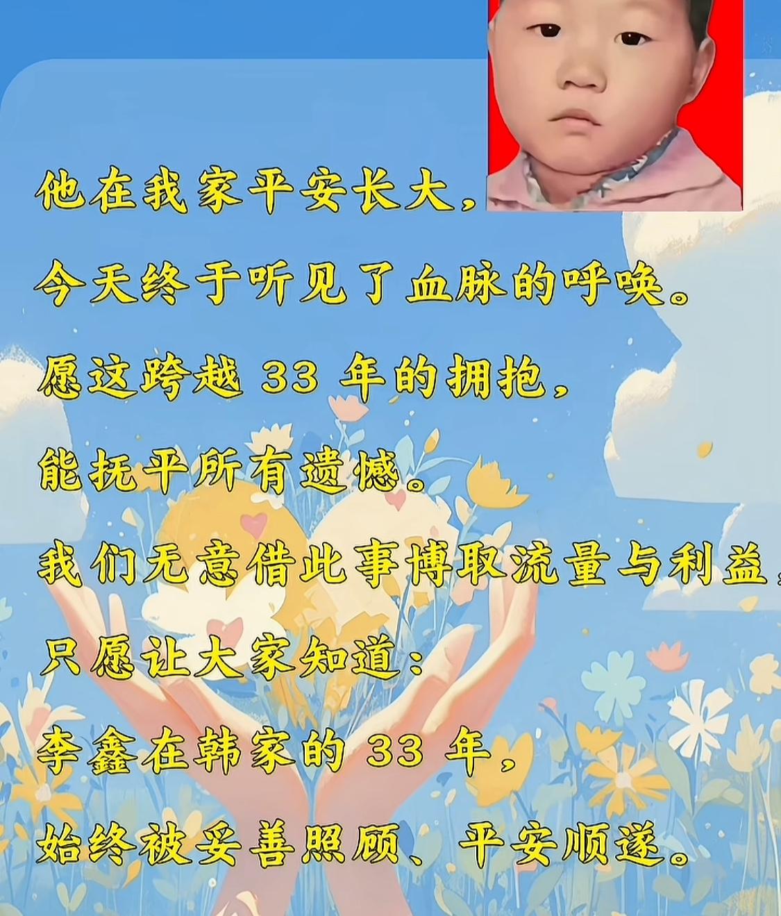 李鑫养家哥哥:李鑫这33年在我们韩家平安长大,始终被妥善照顾。今天终于听见了血脉的呼唤,愿这跨越33年的拥抱,能抚平所有遗憾。我们无意借此事,博取流量与利益。 李鑫称:是到了养父母家后,才开始读书的,而且还上的贵族学校。养父母怕李鑫一个人去贵族学校上学被人欺负,就让哥哥陪他一起贵族学校上学。 李鑫说自己结婚以后,因为老婆身体不是很好,早产儿子一直由养父母帮他们一起照顾。现在儿子已经5岁,在上幼儿园了,而他主要负责赚钱养家,所以他没有太多心思去刷网络视频。