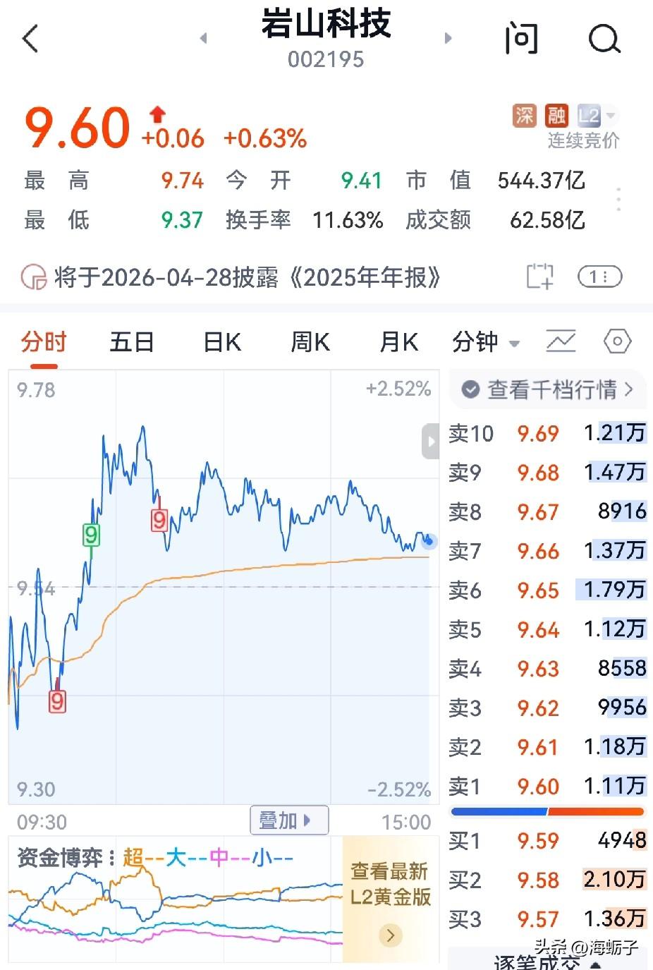 收盘了,岩山今天收了个小阳线! 早盘9.41元低开,以为今天又是震荡下行的一天,结果最低下探到9.37元,开始震荡上行,最高摸到9.74元,收盘9.6元,换手率11.63%,比前两天少了不少,流出资金的也减少了不少,看来有主力、散户开始逐步建仓了。