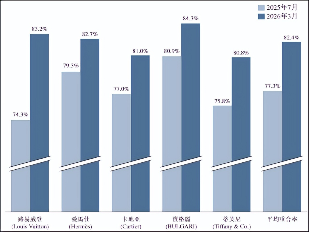 弗若斯特沙利文调研资料显示,老铺黄金消费者与路易威登、爱马仕、卡地亚、宝格丽等国际五大奢侈品牌的消费者平均重合率从2025年7月的77.3%提升至2026年3月的82.4%。财报原文指出,“老铺黄金消费者与国际奢侈品牌人群高度重合,具备高端消费特点,验证了品牌的高端定位。”