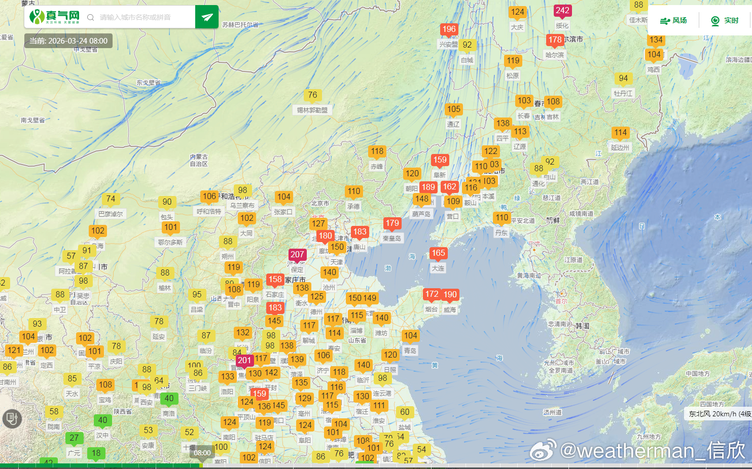 从今天8时空气质量看,东北华北黄淮江淮等地依然存在一定程度污染,黑龙江绥化、河北保定、河南焦作出现重污染,对应有霾。短期内没有明显的冷空气影响这一带,因此24-26日霾还会持续。27日以后有冷空气到来,霾会减弱。