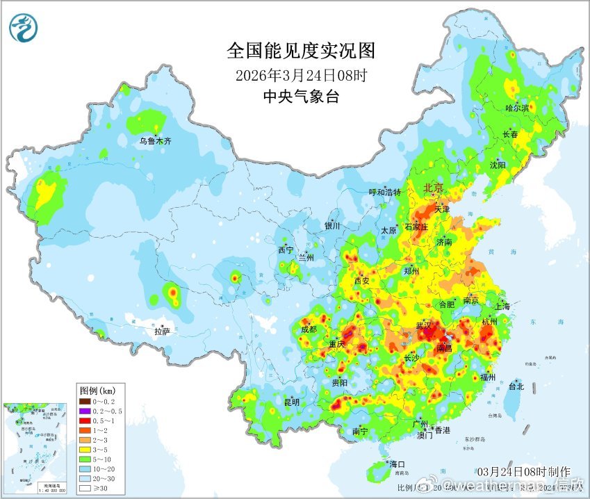 【雾 霾 沙尘】今晨中东部地区有分散的雾,有的是雨雾混杂。部分省区市8时能见度最低站点:安徽九华山46米、湖北竹山65米、福建九仙山80米、山东石岛82米、甘肃西峰82米、云南龙陵83米、广西南丹87米、重庆丰都94米。