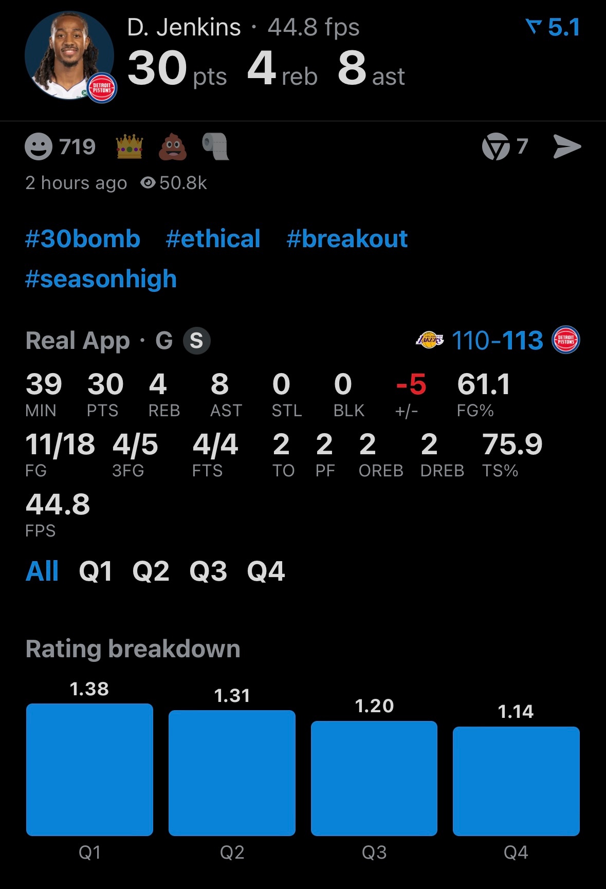 半年前詹金斯还是一个双向球员,今天打出职业生涯新高。 湖人vs活塞