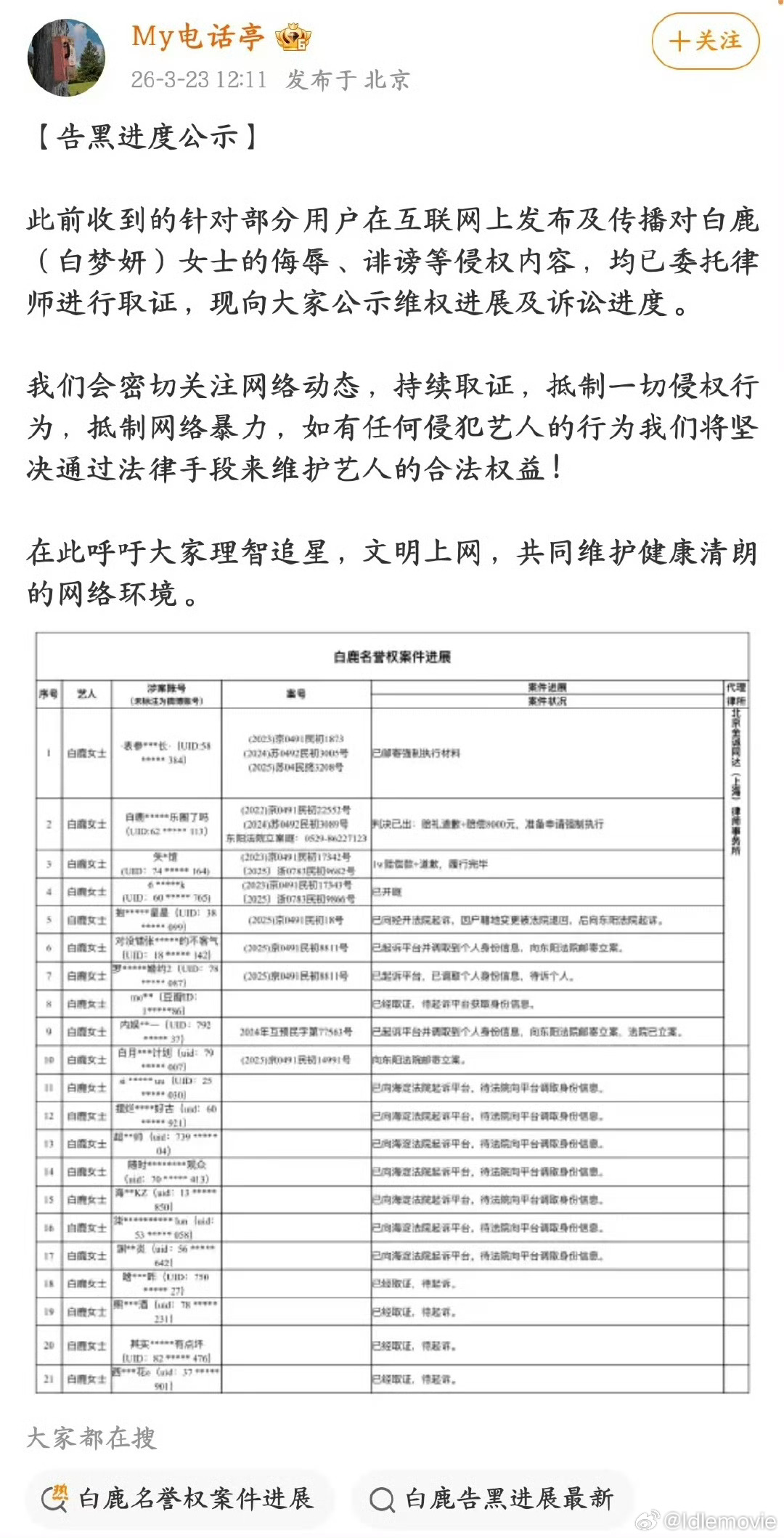白鹿给黏黏写的应援文案白鹿白鹿名誉权案件进展