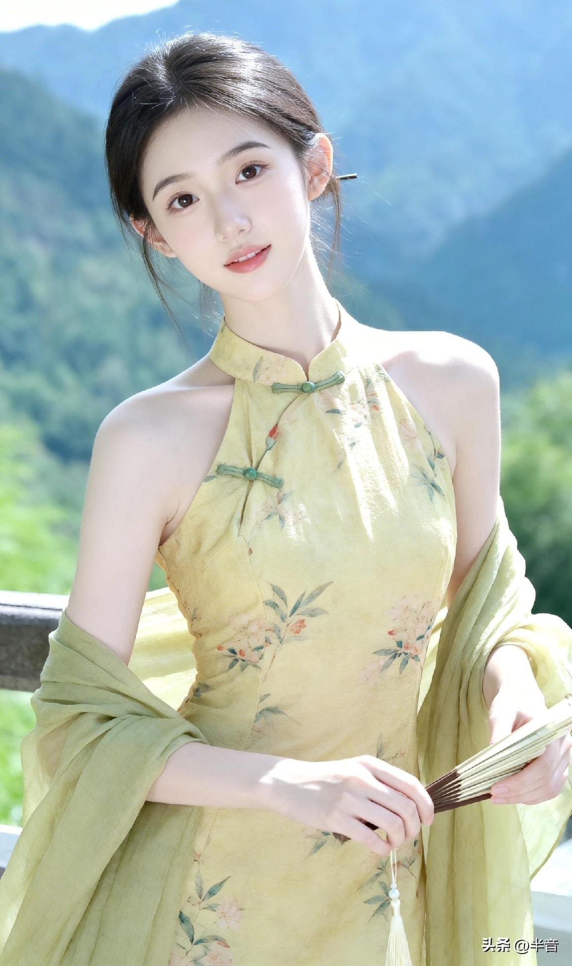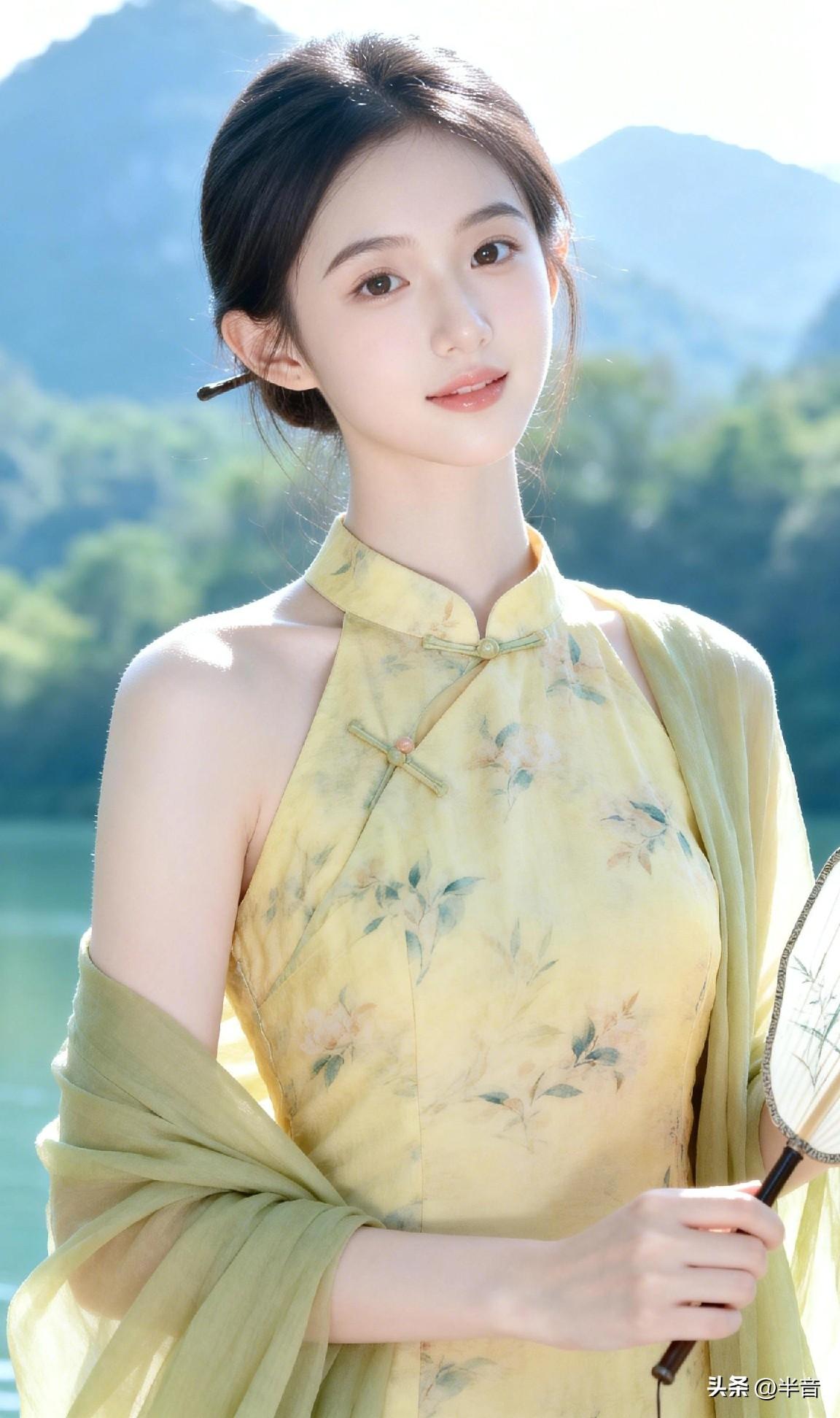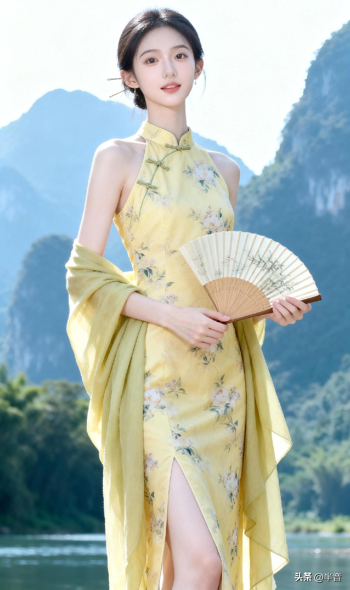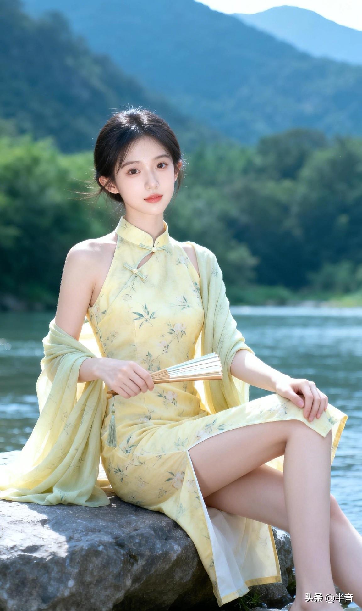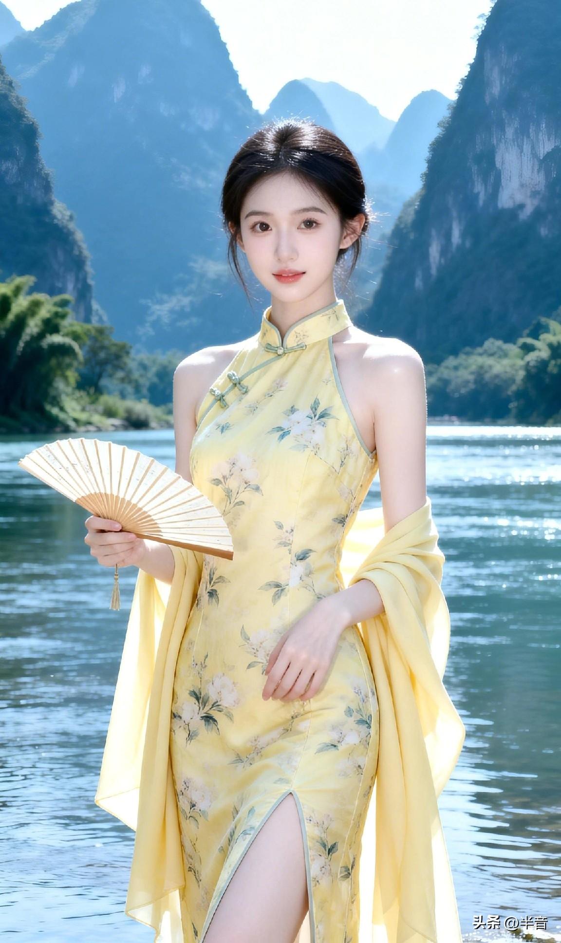 山是眉峰聚 水是眼波横🌿 黄裙映碧水,旗袍衬佳人