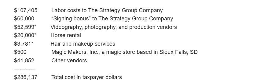 美国参议院司法委员会民主党人公布了前国土安全部长克里斯蒂·诺姆骑马出现在拉什莫尔山为主题的广告宣传活动花费 以下列出部分费用,其中包括马匹相关费用: 3800美元用于化妆 2万美元用于租马(非购买) 拍摄团队薪酬22万美元 42000美元用于拍摄团队的餐饮。