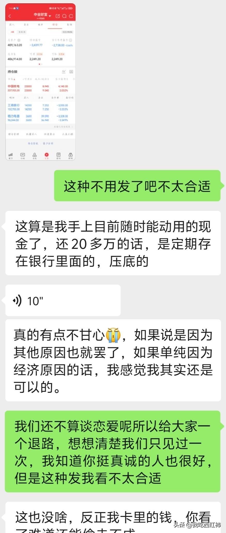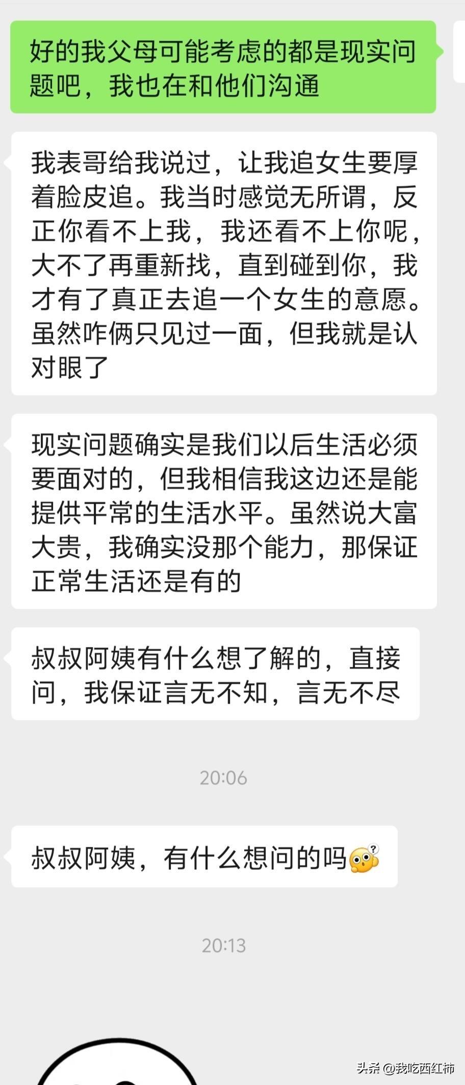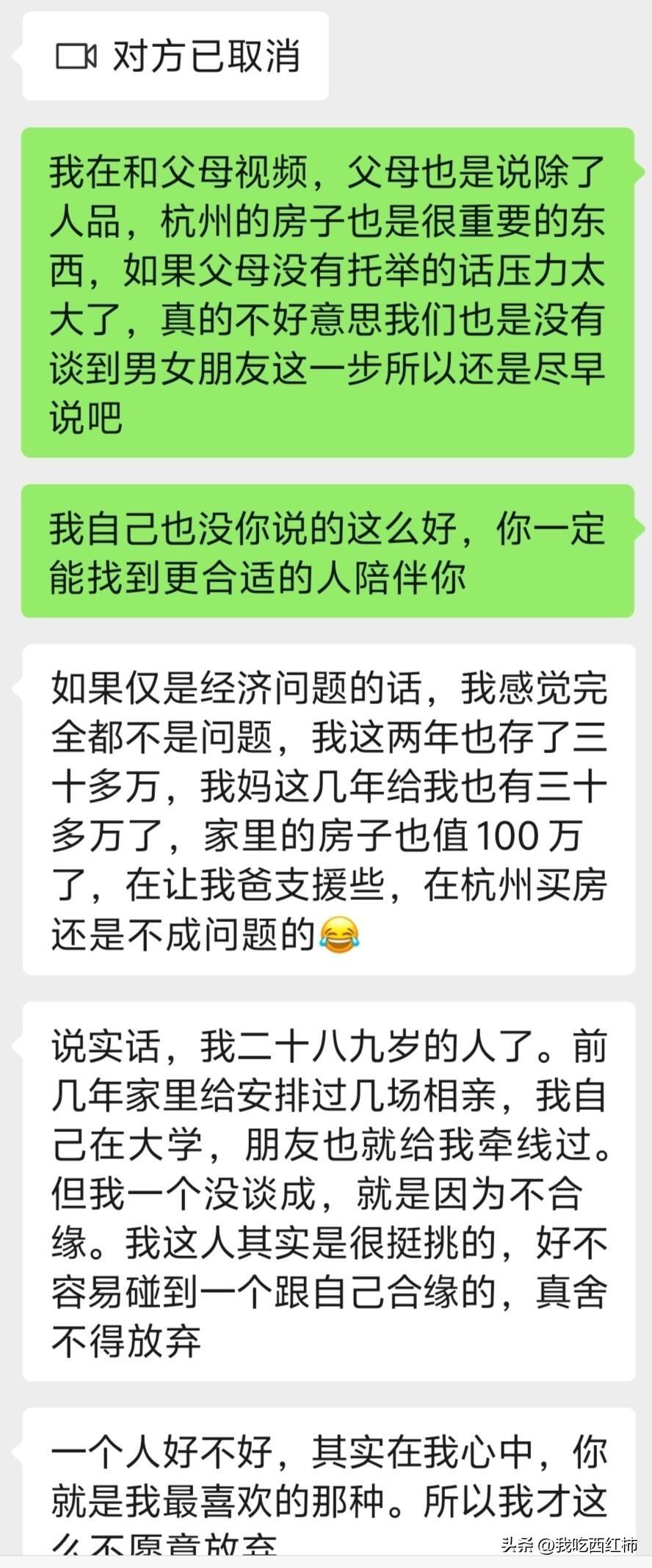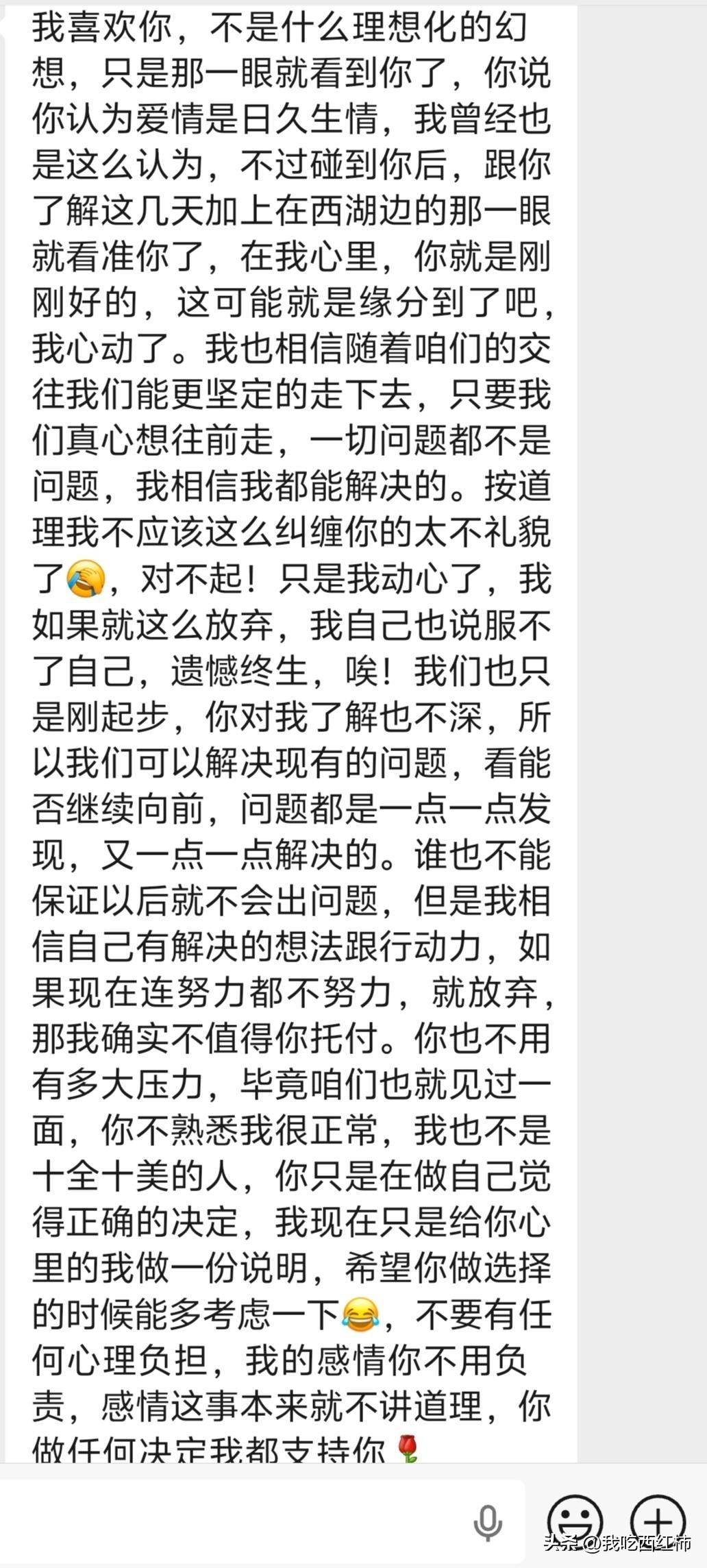 相亲对象遇到很好的人咋办啊? 父母不同意觉得对方家庭条件最多能和我们家持平,杭州的房子未必能全款最多贷款 但相处下来他人真的不错,我也有好感,细心体贴有修养,没见面前在陕西老家同城送杭州的花给我,见面后也一直请客虽然我也不想让别人破费婉拒了,每天两人聊的很投缘,我觉得就算是装也挺累的吧 之前也有拒绝不太合适的相亲对象,最多人家纠缠了一会也尊重我的意愿,但我真的没想到这个相亲对象这么坚持,尤其最后一张小作文写的挺打动我的 好朋友的想法是可以先谈一个月左右,万一真正深入后发现确实聊不到一块,都是彼此理想化的那也没什么遗憾的 我好乱,我要安静会